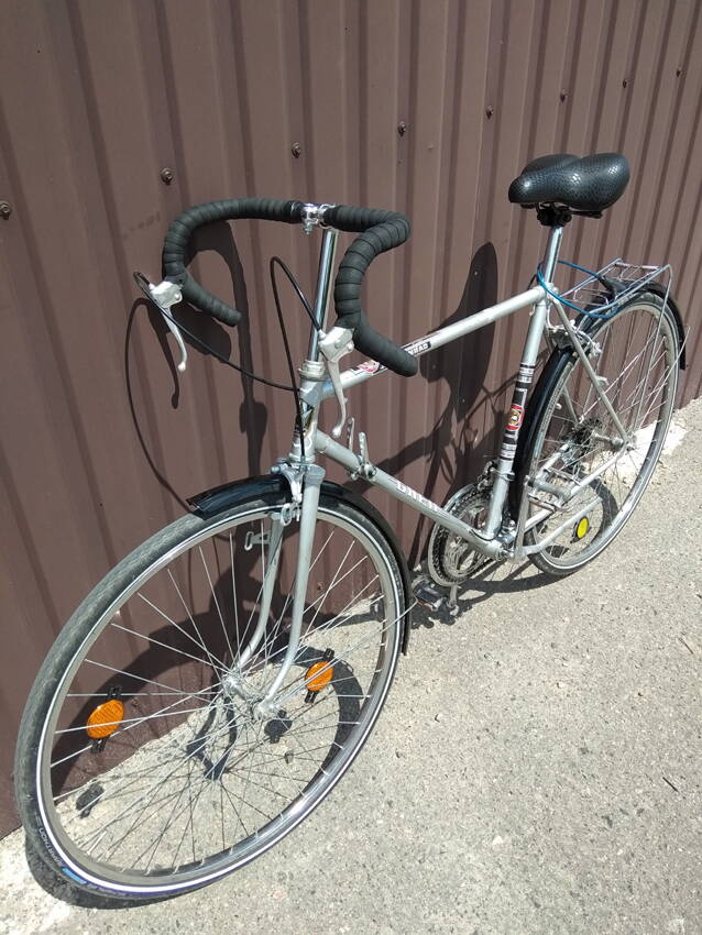 Может быть и не совсем шоссейник, а нечто среднее, у него узкие покрышки, по-моему 3 см, нетяжелый вес около 12 кг, и руль-баран. Но при этом есть металлические крылья и небольшой задний багажник, и даже подножка). Так что да, это наверное городской тип велосипеда, но в стиле шоссейника. Интересно бы узнать, существуют ли каталоги велосипедов, чтобы посмотреть хотя бы год его выпуска?
