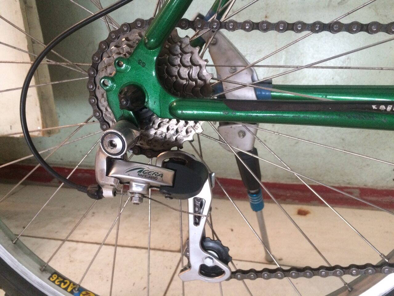 Тормозов не было, цепь ржавая, звезды засраны, переключение передач не работало нормально, сильный люфт каретки и кассеты на заднем колесе.. Сильно скрипел при езде. Задняя перекидка сильно грязная была.