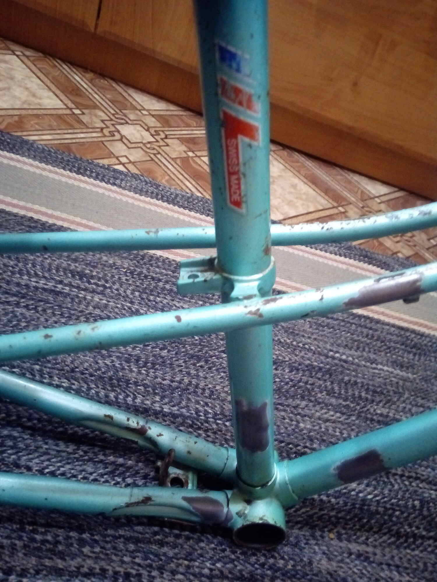Уважаемые форумчане, мной была за недорого приобретена велосипедная рама ( тип- микст, искал с что-то из легированного и чтобы влазила покрышка 37 и чуть больше, а также было желание :roll: поставить 27,5",хотя сама рама под 26"), судя по надписи швейцарского производства. Но видимо не хромоль, так как он имеется в наличии и звук у него глухой, а у этой звенит.Вес данной рамы :shock: при таком то хим. составе -2,85 кг. Размеры: по подседельному штырю- 52 см.,от каретки до дропаутов- 44 см.,от центров рулевой до подседельного- 56 см., в общем "Старт-шоссе длинный".