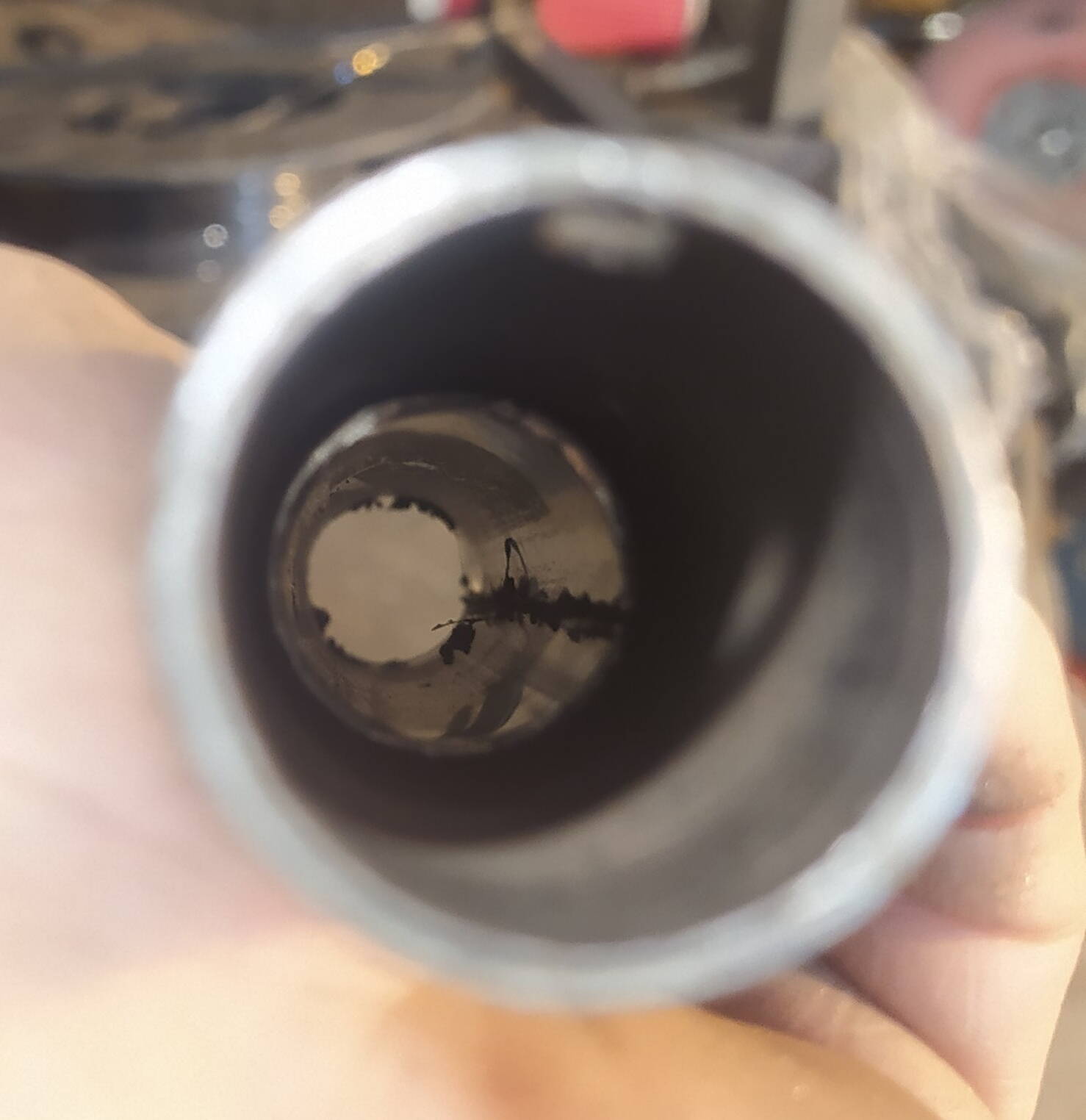 А вот изнутри труба эта рассверлена или расточена начисто диаметром 22 мм на глубину где то 2\3-3\4 от длины штока. Внизу изнутри остаётся приличный кусок трубы со швом внутри и кривоватой геометрией.