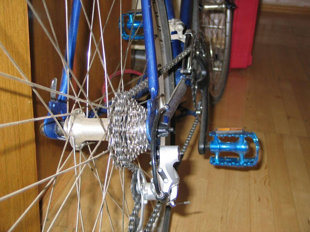 3. Задний переключатель. Раньше не не работал, его чуть реанимировал, но хренова работает, максимум что можно сделать - настроить его на одну скорость и зафиксировать. Тросик я купил в ОБИ, он тоньше (след. по толщине не влезет). Похоже что он немного растягивается. Короче с переключалкой проблемы. Если натсроить чтобы на педалях большая звезда, на колесе вторая по величине, то та штука под переключалкой с двумя колесиками (напоминает " & ") как бы трет цепь, как бы перекашивается.