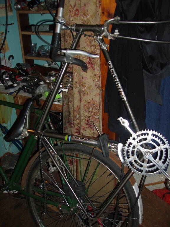 Но сегодня утром получил здесь от коллеги Юрия ака Po2l сообщение с просьбой избавить его от барахла ХВЗ, пока он его не выкинул. Каковую просьбу я, пересев с Табуретки на Трофейный, с удовольствием и исполнил. В своё счастье я поверил, только разгрузив всё дома :). Там и педальки оказались в отличном состоянии, и кое-какая нужная мелочь (спортивное кожаное седло под восстановление с непотеряным механизмом натяжения, например :-P ) А основное - велосипед "Спорт", который из самых поздних переименованных "Старт-Шоссе" 92 г.в. Комплект, но не на ходу. Убедился, что стартон (пардон, Спорт) того года сделан гораздо качественней, чем Турист. С некоторыми деталями (втулки, тормоза), которые "закошены" под СЗ, но в массовом обличье.