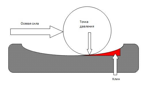 Канавка обоймы имеет радиус на много больший радиуса шарика. Если представить канавку как два клина получаем при осевой нагрузке шарик выезжающий на клин. А как известно из школы, клин - это усилитель и его усиление зависит от угла. Чем меньше угол - тем больше усиление. А угол в подшипнике стремится к нулю (клин полукруглый) следовательно сила стремится к бесконечности.