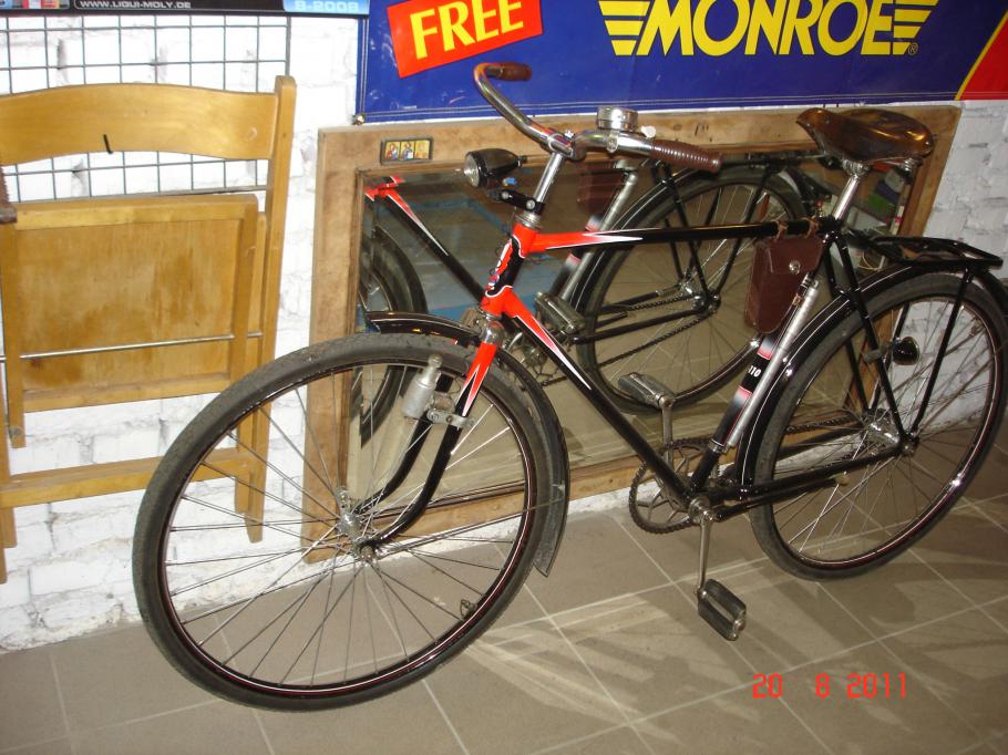 Оффтоп:(НЕ удивлю вас информацией , что в Беларуси уже 7-10 лет идет серьезная охота на металолом из-за повышения закупочных цен. Поэтому большинство авто-мото-вело- раритетов уже давно утрачено безвозвратно, я слишком поздно занялся великами, приходится клевать жалкие крошки на металоприемках и ныкать по сараям и гаражам знакомых.) Гляньте на ФОТКУ МОЕГО исходника - ни ободов, ни хрома. Короче, простыми абразивами и полиролями набивал руку. А обода с красными полосками, стало быть и раму в красных цветах буду рисовать. А вот для примера ХВЗ кого-то из наших комрадов. Правда, СЛИШКОМ пестрая раскраска. Но вроде правильная по контурам полосок и "кисточек" Какие будут мнения, можно ли взять на пример?