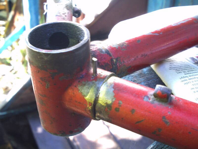 Покрутил я обе рамы в руках, и решил, что горизонтальная труба (которая мне нужна) на жёлтой вполне мне годится, а низ выправлять действительно геморно. Вобщем, взял я для начала красного Спутника, и по всем понятиям залечил ваву серебряным припоем, даже не забыл заштифтовать предварительно (ему раньше такое и не снилось :D ).