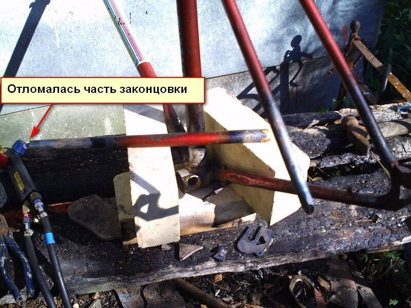 Я на радостях увёз эту рамы на дачу с намерением выпаять из неё трубу-другую :pisec: , которых не хватает для очередных монстров. Ну, то есть, рама была уже мысленно похоронена, как таковая, но с идеей дать жизнь новым велосипедам при помощи её органов. Бррр - маньячество какое :D .