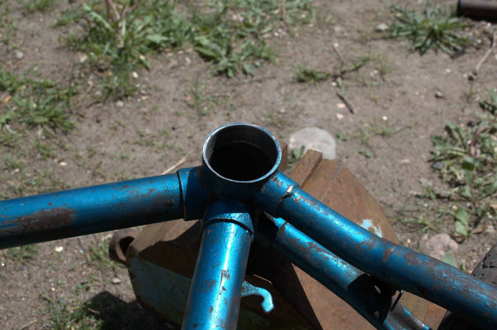 Демонтируем каретку. В моем случае(и так делать в общем то не следует) я положил раму на деревянную подставку. Расположив таким образом чтобы она она на нее опиралась всеми трубами рамы, а вывешен был только кареточный стакан. И далее сильными ударами по торцу вала каретки через мягкую проставку выбиваем вал. Три удара в моем варианте. Хитрость в том что я бил со стороны где был уже люфтящий подшипник и на его кончину мне было все равно. А из за увеличенного износом посадочного места в стакане внешние обоймы почти не фиксировались.