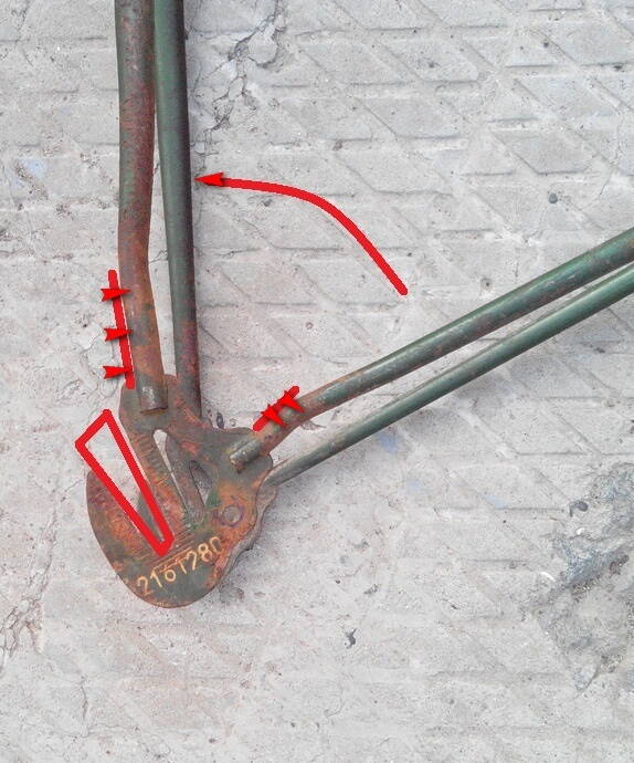 Мне подобную хню удалось вылечить легко одним движением. Правда сначала был гемор изготовить приспособу :D На толстый лист (лучше на полку уголка №50-63) наварил примерно такие фиговины, обеспечивающие упор, сам уголок зажал в большие тиски. Раму поворачивал до выравнивания. Потом немного достучал там по мелочи. Дроп из приспособы норовил выскочить - приспособил друга, он не пускал :D . Но можно типа струбциной или ещё как-то зафиксировать, даже болтом через центральную треугольную дырку дропа.