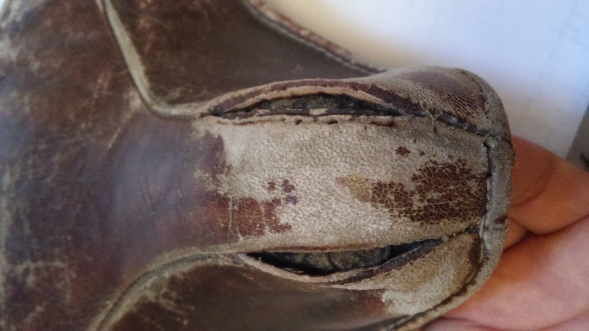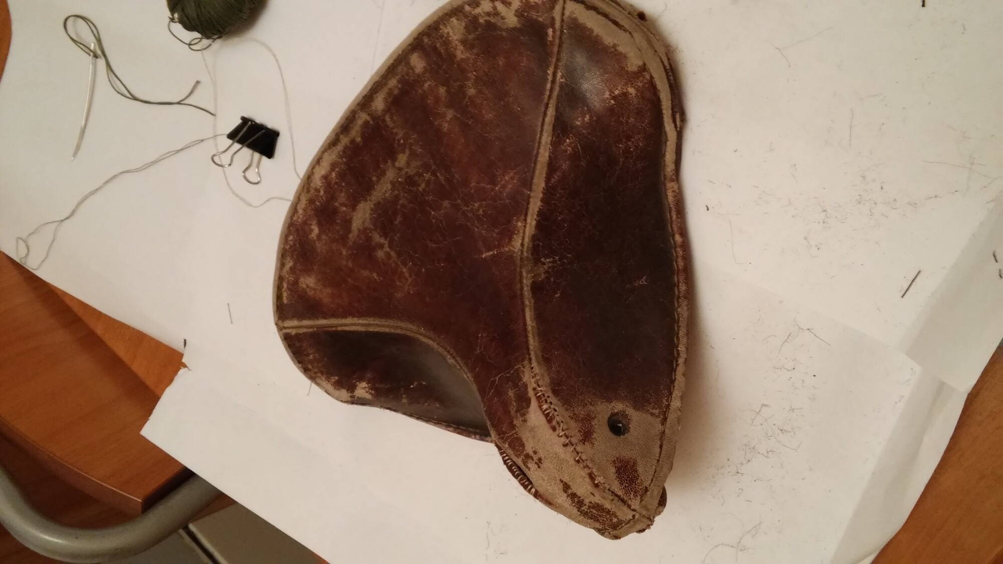 Подшил войлочную основу суровыми нитками и разошедшуюся по шву кожу изнутри с попаданием в существующие дырочки от старой нитки. Мне кажется получилось не очень айс, но есть возможность все вернуть обратно (то есть удалить новую нитку/штопание).
