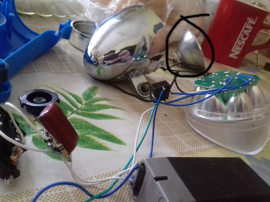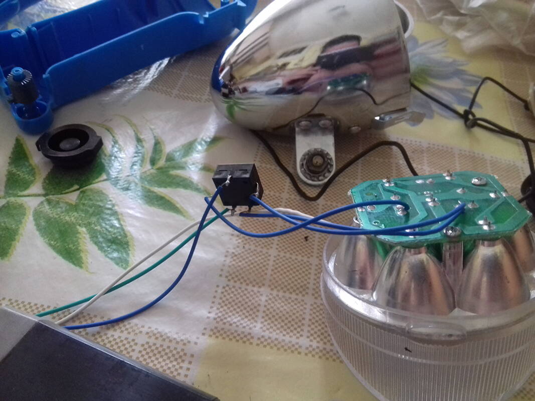 Изначально был куплен вот такой набор (фото №1) за символические 300 руб. Конструкция повторяет советский аналог: по лампе 6,3В в каждой фаре и динамка, приводимая в действие от колеса. Маленькая лампочка в паре с дрянным отражателем позволяют получить слабое световое пятно практически перед самым колесом, а вот тормозит колесо динамо-генератор существенно - сразу чувствуется, что для езды необходимо применить значительно больше усилий... В общем за винтажный вид - 5, работоспособность же - на троечку. Прошло около двух месяцев, как-то проходя по рынку,находящемуся не так далеко от дома и существовавшему сколько себя помню, я обратил внимание на фонарь марки Ultraflash (фото №2) т.к. "на глаз" окружность его корпуса совпадала с окружностью корпуса велосипедной фары. План созрел мгновенно, что если совместить классический корпус с современной начинкой,способной эффективно и без усилий освещать ночную дорогу? Фонарь,имея световую мощность 140лм светит очень ярко, создавая пучок света метров на 30+, также большим достоинством является наличие свинцово-кислотного аккумулятора, который заряжается от сети за 3-4 часа. Обошлось это чудо китайской техники в 350 руб. По приходу домой начались опыты, светодиоды фонаря с отражателем идеально подошли к корпусу крышки-стекла велосипедной фары (фото №3,4,5). Для начинки также места внутри хватило с запасом. Также с передней фарой функционирует и задняя, в которой лампа заменена боковой панелью фонаря, имеющей 4 светодиода.