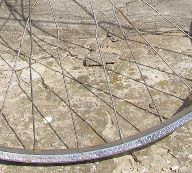 Восстановить обода Rigida думаю будет проблематично - если переднее колесо в более-менее сносном состоянии, то заднее колесо - без половины спиц, причем натяжение спиц производилось народным методом - путем изгиба спицы пассатижами (см.фото)....