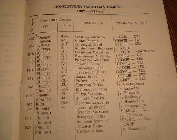 Нашел на просторах нета страничку с фамилиями гонщиков выиравших критериум ЗОЛОТЫЕ КОЛЕСА . Среди них Станислав Сергеевич Титаренко , Жулавский Сергей Григоревич и Анатолий Бессонов . Страница находится на ресурсе который описывает коллекцию Влада Карганова http://velosov.blogspot.com/2013/01/blog-post_24.html . Но призового Рекорда ... такого как на фото я не то что бы видить я даже не слышал . Хотя на критериум ЗОЛОТЫЕ КОЛЕСА я ходил смотреть с 1973 года . Похоже кто то деколи наклеил и там самым ввел в заблуждение велосообщество .... :facepalm:
