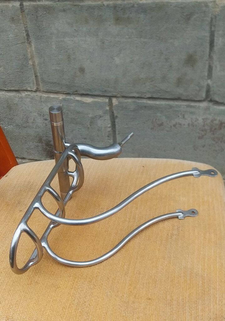 1. Напомню, что на отправку в покраску мною подготовлены 2 вилки (1 - экспериментальная, со сборным штоком). Она изначально имела 2 отверстия в каждом дропе. И поскольку, мне не известна длинна будущего переднего крыла, рассматриваю вариант его крепления на дополнительную дугу из прутка. Для этого подготовлены и на дропы напаяны дополнительные "уши" с резьбами: