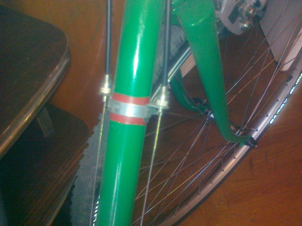 Из-за отсутствия оригинального хомута для нарамных манеток на моей Cinzia "Vittorio Adorni" пришлось поставить манетки на вынос, а пустое место на раме осталось для упоров рубашек тросиков, сейчас там некрасивая конструкция из металлических стяжек-хомутов для труб.