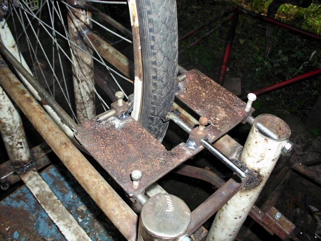 Если колесо шоссейное, тонкое, и крыла нет, можно из дюраля вырезать прямой бустер с небольшой проточкой под колесо. На Табуретке (толщина шины 20 мм) я сделал его из дюраля 3 мм: