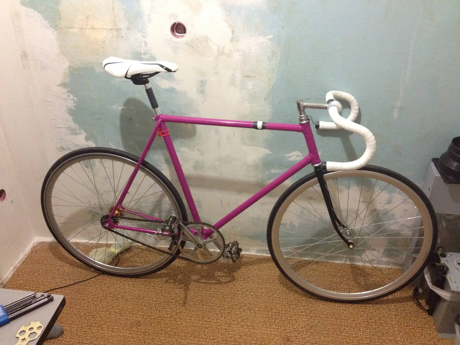 Через пару часов после этого я наконец увидел раму с хозяином Дмой в живую. Дропы действительно оказались печальными, мы выдвинулись ко мне домой ровнять их в тесках и собирать из того что у нас есть велосипед. Через час танцев с разводным ключом и тисками дропы приобрели культурный вид.