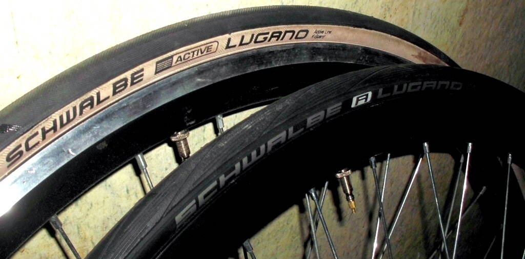 Короче, встретились на одном веле швальбе лугано старого дизайна, намученая под заказ в "Помаранчовом Роверi" (со светлой боковиной - по дизайну нужна) и нового, купленная в "Велобазаре" (отличный магазин, хотя все знают, как я люблю веломагазины :D ). Обе 622х23, до 9 атм. Новая с рисунком протектора, причём направленым. Как Вадим показал.