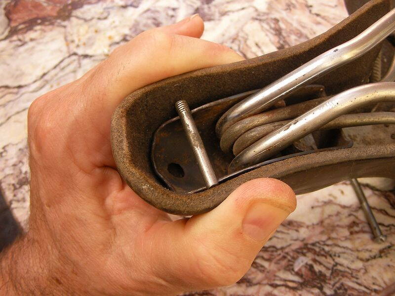 Т.е. мне не хочется устанавливать клюв на родных скобах. Чтобы их поставить, нужно точить медные заклепки или искать родные хромированные новые. Медные не хочу ибо они желтые. Вариант на нерж. болтиках не прокатит, т.к. не поместятся гайки. Алюминий - пошло. Седло должно стать черное, с прошивкой красной нитью и нерж. креплениями. Сзади все получается на болтиках, а вот как быть с клювом - ХМЗ.