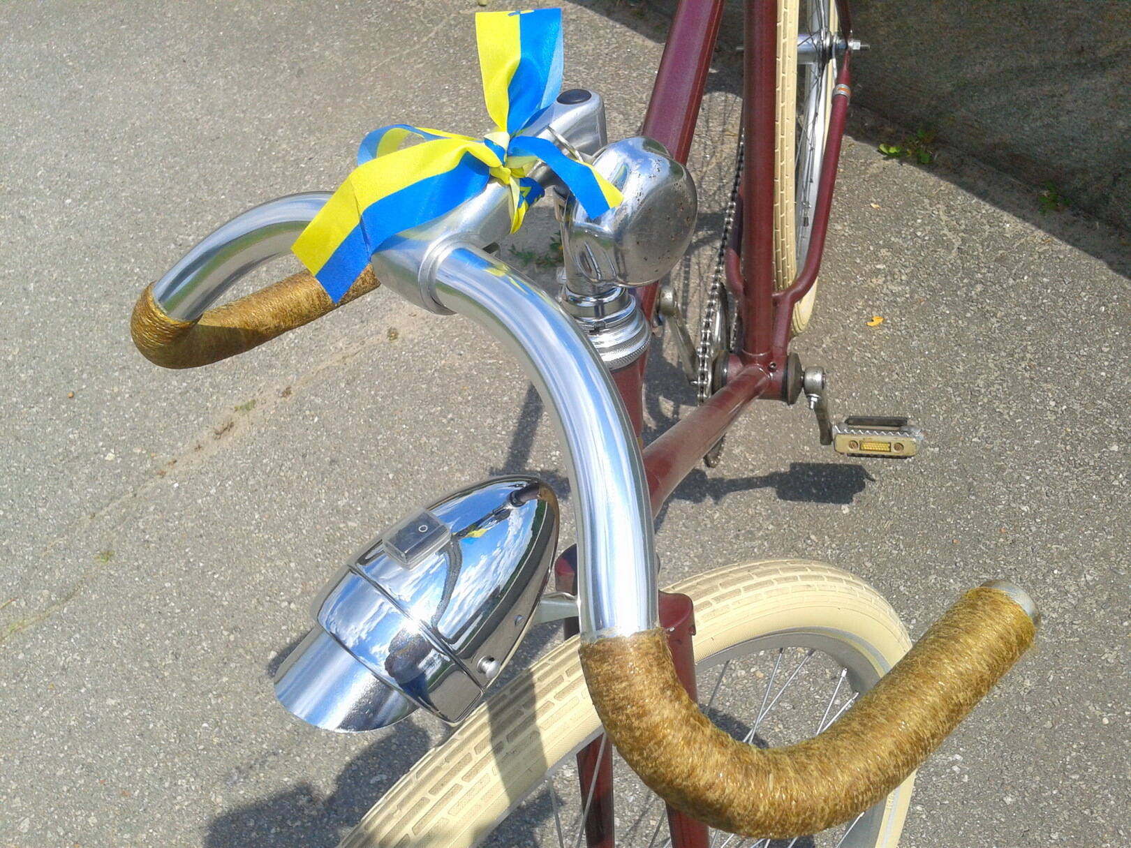вчера и сегодня было свободное время залакировал (нитролаком обычным) руль, а точнее нитку, сегодня немного наждачкой 500-й колючести стер, поставил руль на вел. Смотрится впринципе не совсем плохо хотя хотелось лучше. Перекинул бардачек на раму... точнее бардачек поменял на коричневый подрамный :twisted: вот только трабл, нету ремешков для бардачка, пока куплю повисит на стяжках ( немного не кошерно, но в принципе тоненькие белые полосочки не сильно глаз режут).