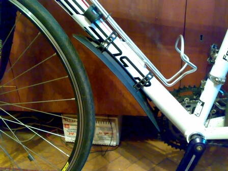 В москве последние три дня были дожди, на работу приезжал совершенно мокрым и я серьезно призадумался по вопросу крыльев. Заднее более-менее подошло от МТБ (крепление на подсиделку), с передним получается полная фигня - даже в голову не приходит, что и как приспособить. Все дело в том, что эта вилка совершенно не предназначена для устанровки крыльев - привожу фотки вида спереди и сзади.