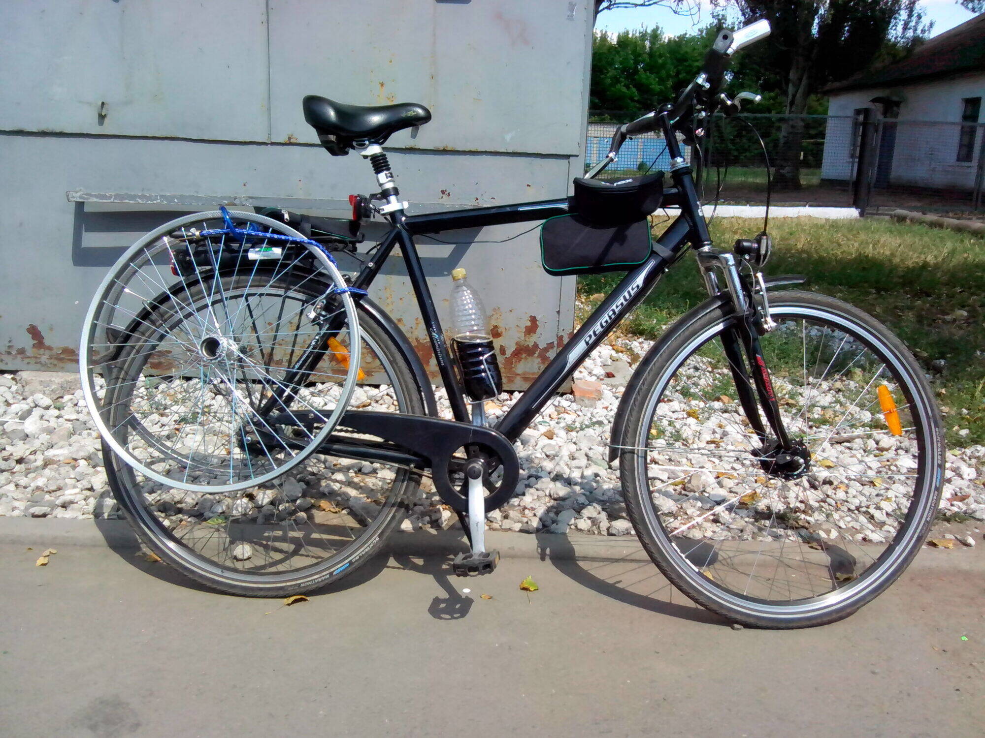 - руль прямая железная палка, длинный низкий вынос, задняя втулка Торпедо, высокий подседел, узкое твёрдое седло, задний багажник, шины 40 мм, крылья, передний тормоз (ви-брейк).