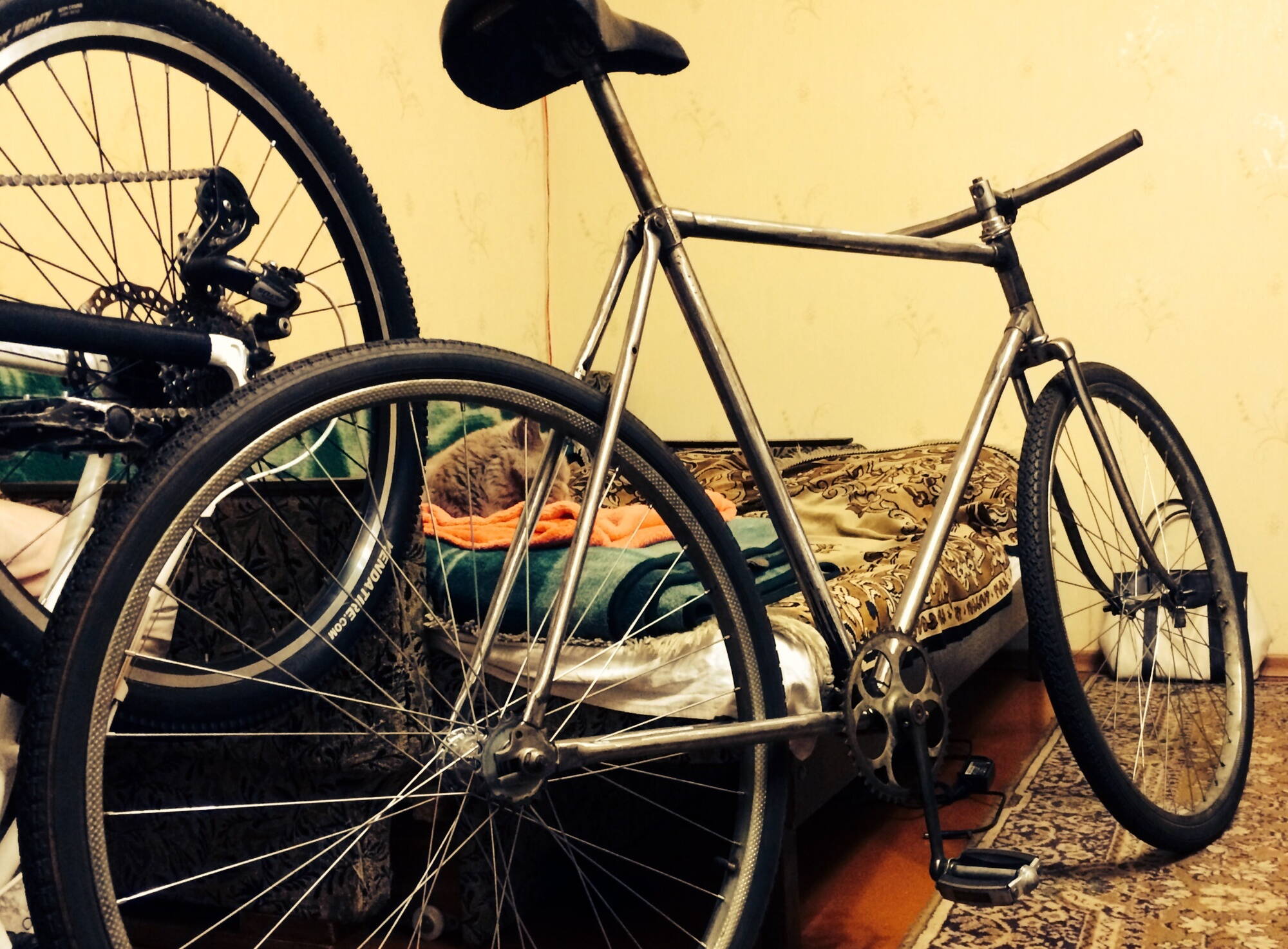 Теперь к трудностям и проблемам. Как можно заметить руль и вынос не совсем тру, они стоят сейчас просто чтобы было удобно. На колесах 40я резина, не знаю какая в оригинале, но вид этой и ее состояние вполне таки меня устраивает. Необходимо заменить переднюю втулку, либо развести вилку, хотел узнать что из этого вы бы посоветовали. Шатуны к сожалению потеряли свой вид, подогнуты, и уже немного разбиты посадочные места. Их точно под замену, на обычные украиновские но в хорошем состоянии. Каретка не совсем хороша, но для начала пройдет, просто немного шумит, есть выработка, но крутится хорошо и люфтов нет. Задняя втулка почему то тоже шумит( хотя смазана была нормально и собрана аккуратно, как работает еще не знаю, не ездил пока.