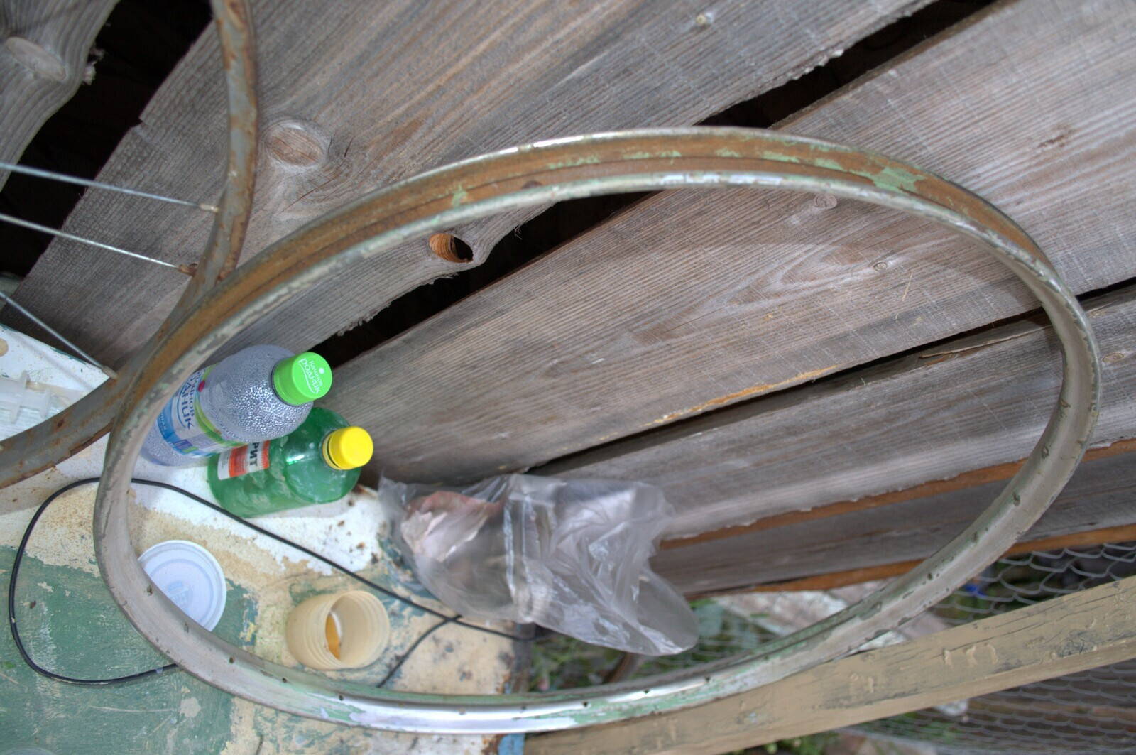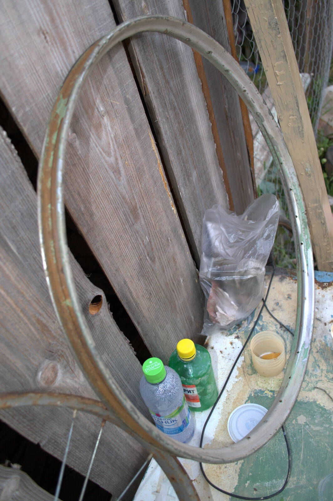 Кладем куда нибудь на удобное место покрышку. У меня был крайне неудобный пень с которого она падала, и периодически мешающий дождь.