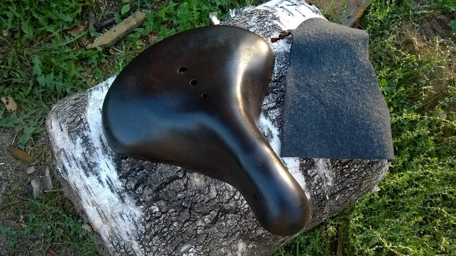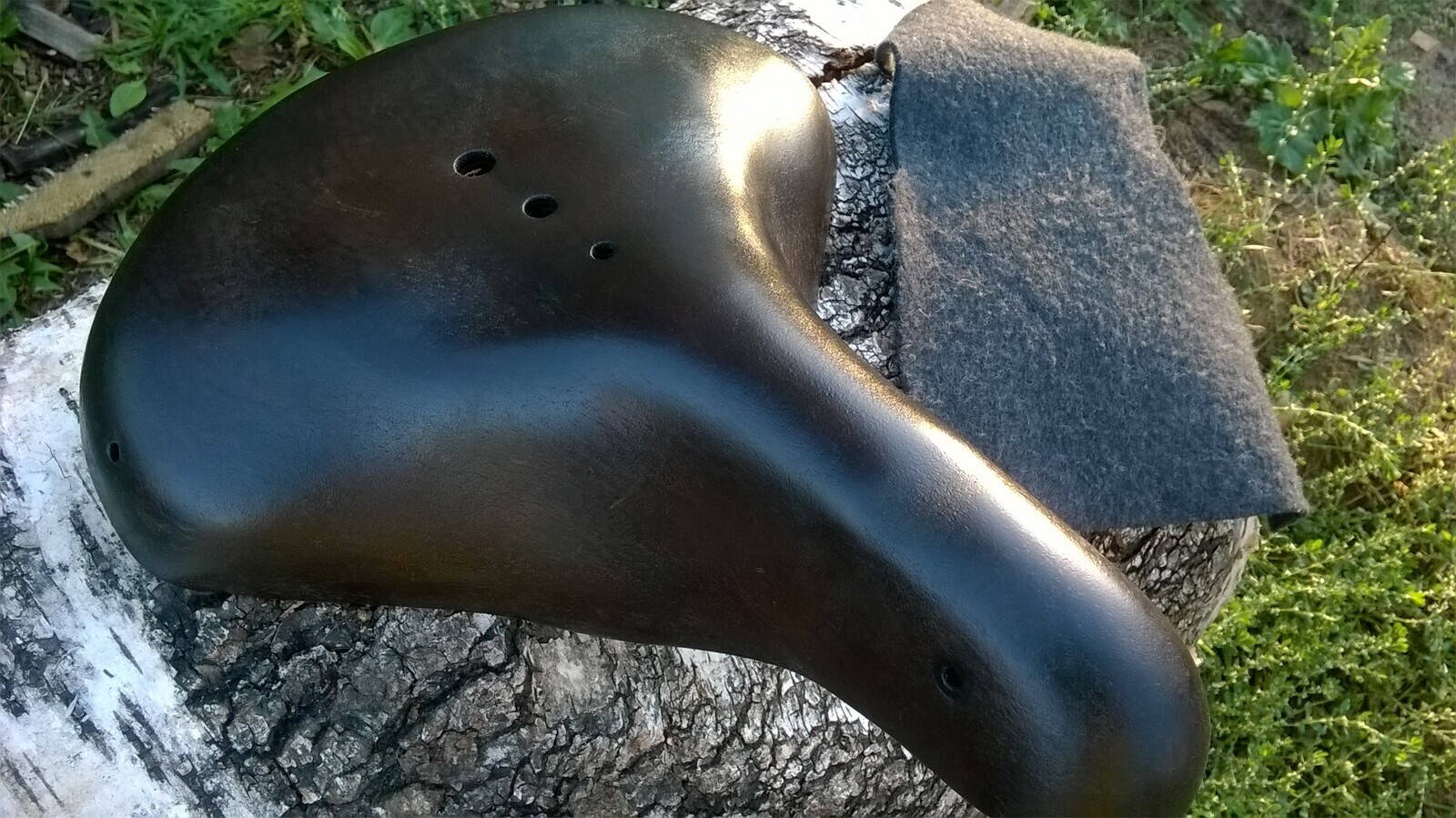 Потом просто прогреваем покрышку чтобы нанесенное впиталось. И так раз за разом пока процесс впитывания не остановится. Цвет будет меняться от непонятных разводов до красивого коричневого с красным отливом. После того как впитывание завершится нужно взять чистый(!!) войлочный круг и аккуратно, не допуская перегрева отполировать поверхность. Я полировал полой от солдатской шинели, вручную. В связи с чем допустил ошибку, так как не снял ворс и он благополучно сел на излишек воска. Пришлось греть седло и свободной рукой скатывать шерсть. А потом заново полировать.