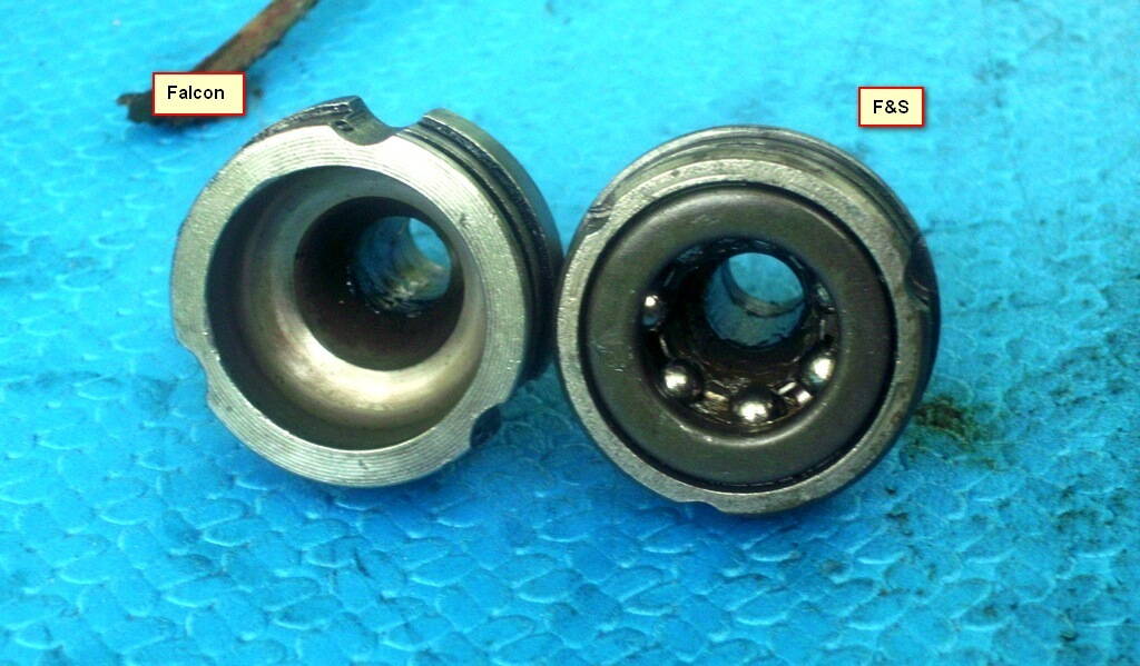Малый подшипник различается креплением пыльника - на Falcon он по-китайски (или по-современному - хз) установлен неподвижно на конусе, на F&S - в чашке. Я поленился выпрессовывать пыльник из немца, ограничился промывкой в сборе и заменой смазки.