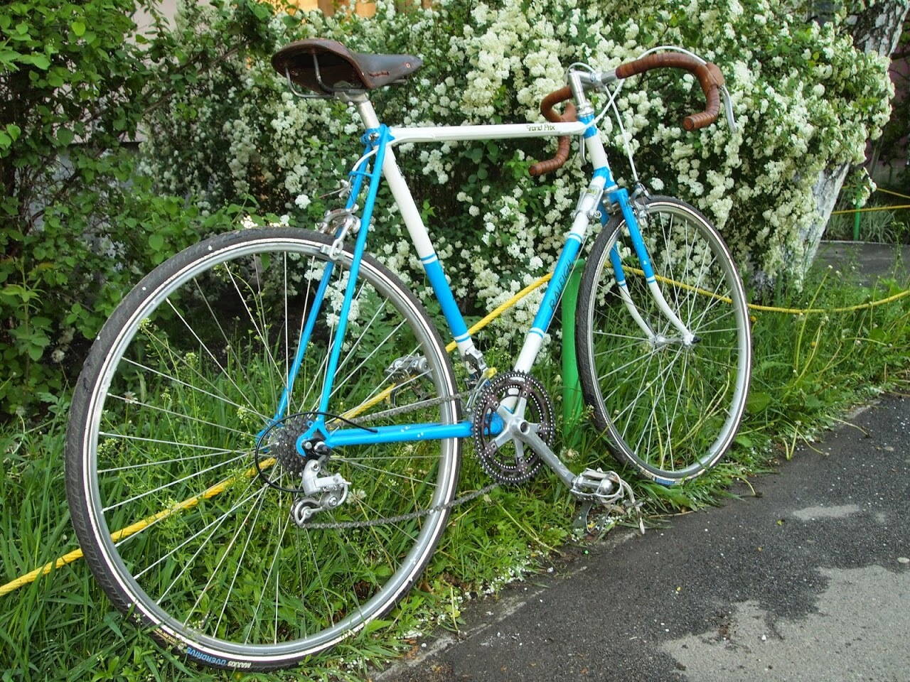 Рама модифицирована по ставшей традиционной рецептуре - из донора вставлен кареточный узел в родную каретку, то же самое проделано с подседельной трубой. Каретка теперь картриджная под квадрат. Колёса родные, но новая резина. Защита на цепь от дорожного Ардиса, слегка подрезана и поставлена на хомуте за перо, но я не особо доволен тем, как она встала. Все сменные детали железные бюджетные. А остальное - просто приятные плюшки: новое седло, корзинка, фара, обмотанные кожей ручки, подножка.