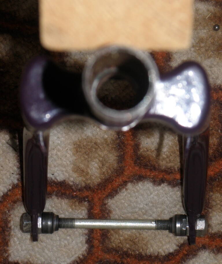 Немного таки подровнял вилку. Воспользовался двумя деревянными брусами. Вкрутил ось переднего колеса в вилку, оба бруса между ногами вилки, тянем в разные стороны - ноги немного смещаются. Идеала я конечно не достиг, но выглядит уже совсем по другому. Кроме того наблюдаю искривление относительно вертикали, попробую позже выровнять. Кстати вопрос, на какую ширину выставлять ноги вилки? (сейчас выставил на 100мм)