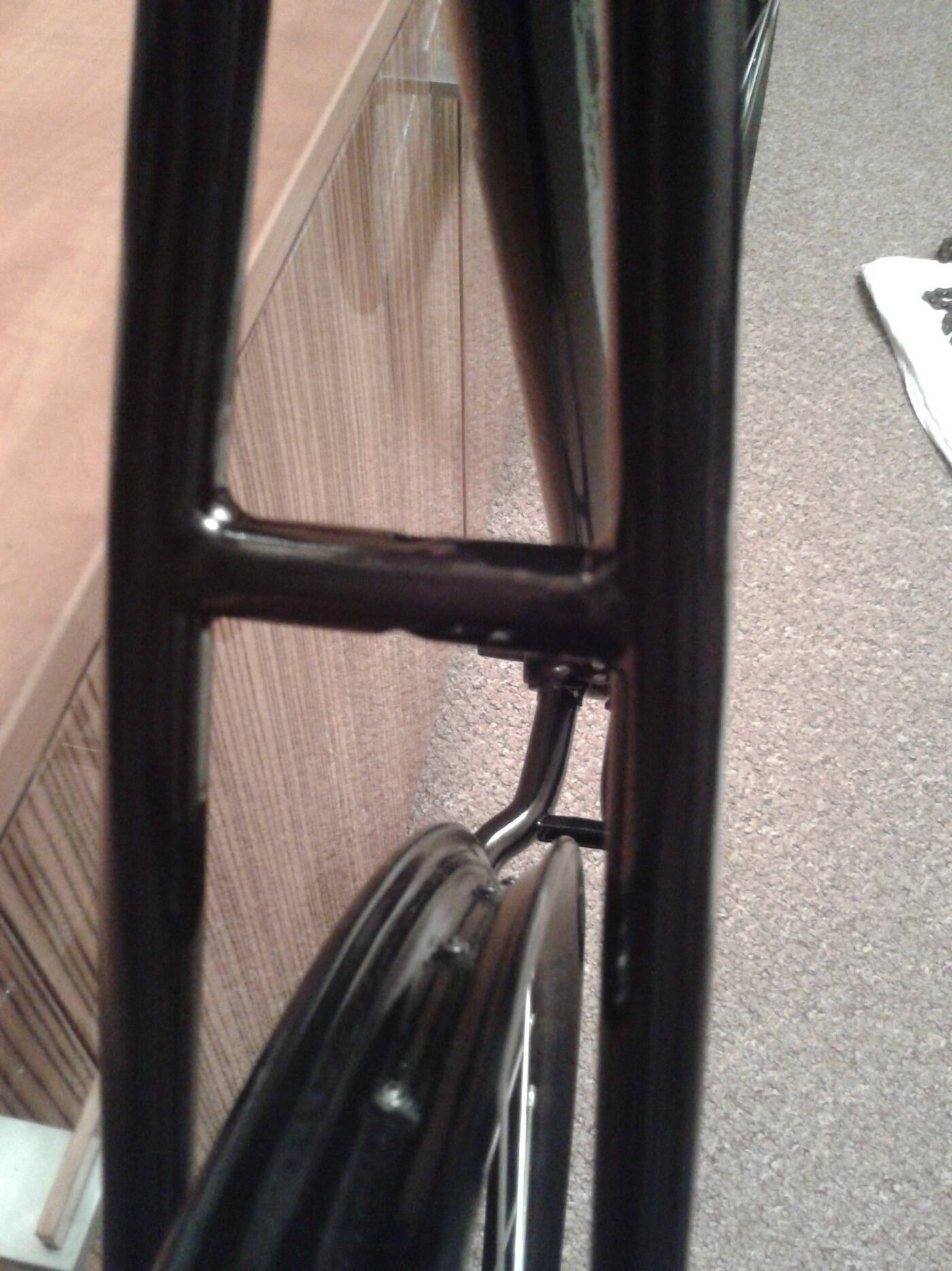 достал старую детскую раму ( о которой ранее писал) срезал кареточную трубу и перемычку. так как кареточная труба полностью не входила во внутрь - пришлось отрезать на длину резьбы и запресовывать кусочки по 3-3,5см. месный сварщик прихватил полуавтоматом акуратненько