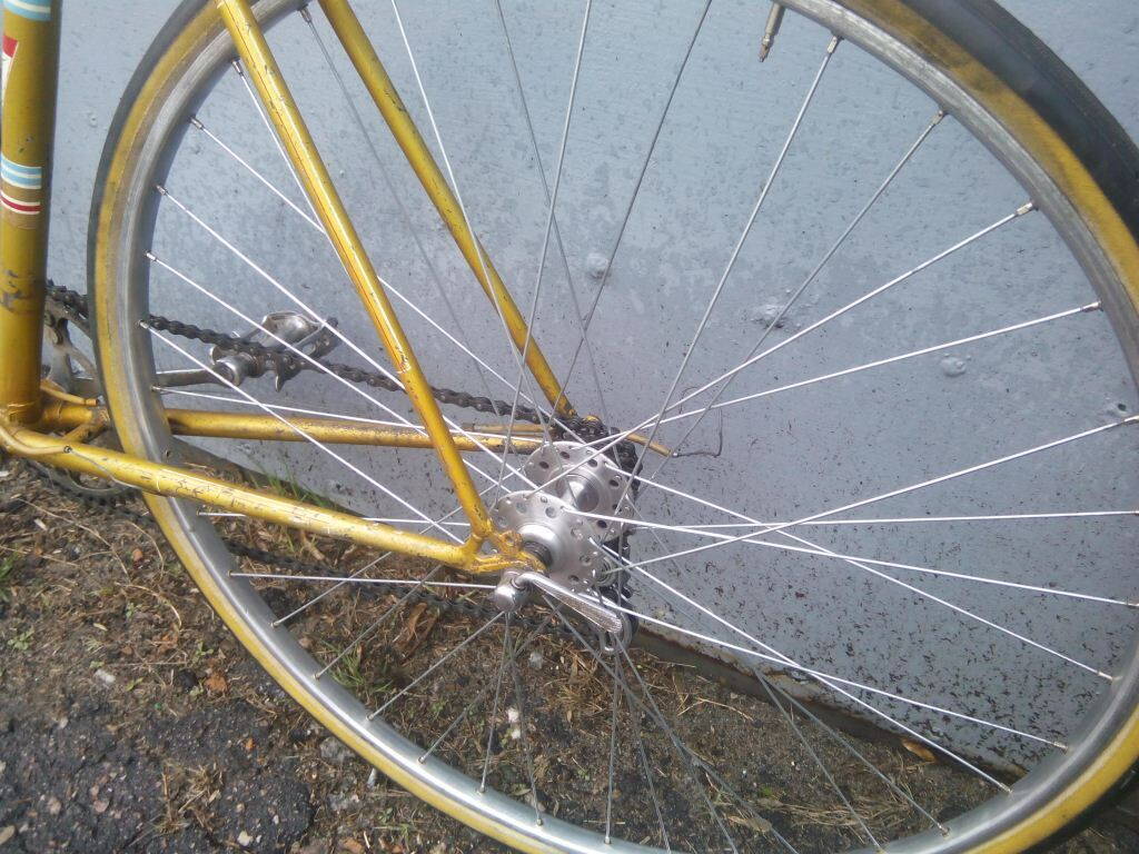 Наконец дособрал заднее колесо. Теперь все колеса с родными втулками :smile: Когда собирал умудрился потерять одну спицу :facepalm: Спиц такой длины я в магазине не нашел. Придется еще раз перерыть гараж в поисках пропажи. Несмотря на это не смог отказать себе в желании примерить новое колесо на велосипед :smile: