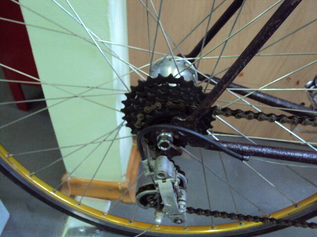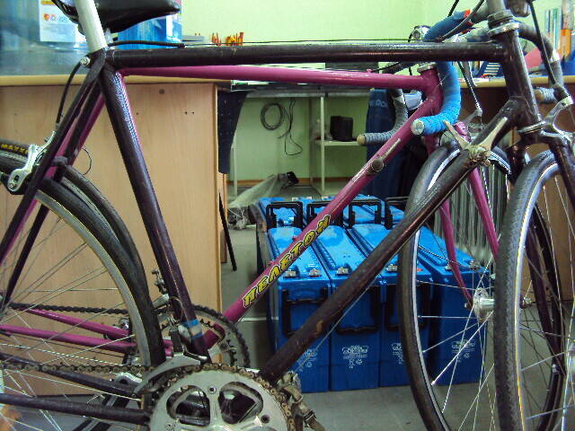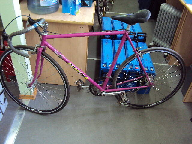 Розовый (по фотке) вполне в боевом состоянии, покрашен, нормальные обода и резина не видно что представляют собой задние звезды и переклюк.