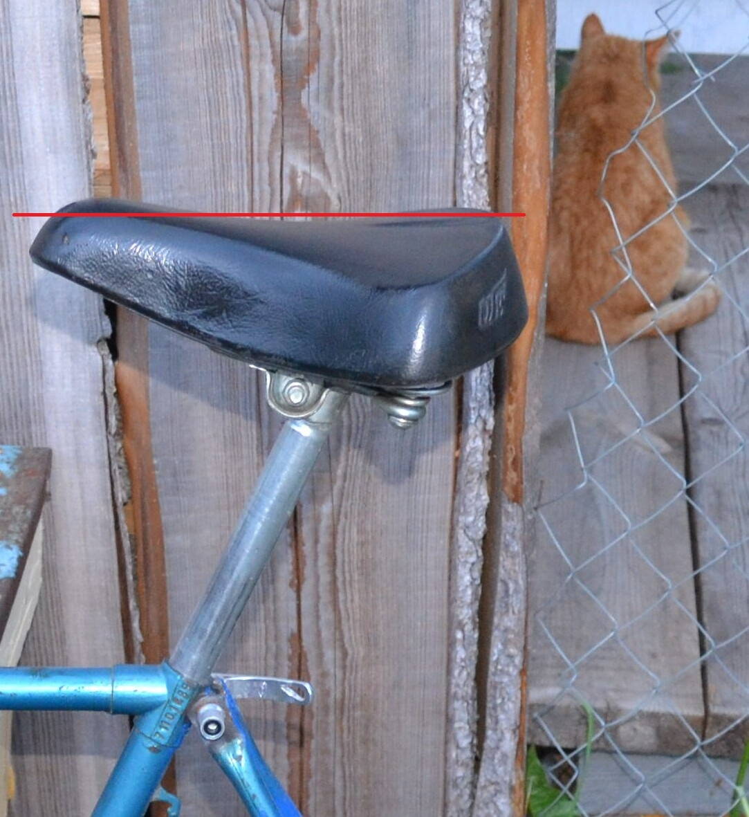 Велосипед таки поехал, если мне не показалось. Дело вот в чем: у советского седла оказался больший диапазон регулировки в горизонтальной плоскости. И путем сдвигания его вперед до максимума удалось получить тот самый результат: а именно прямой угол на согнутых коленях.