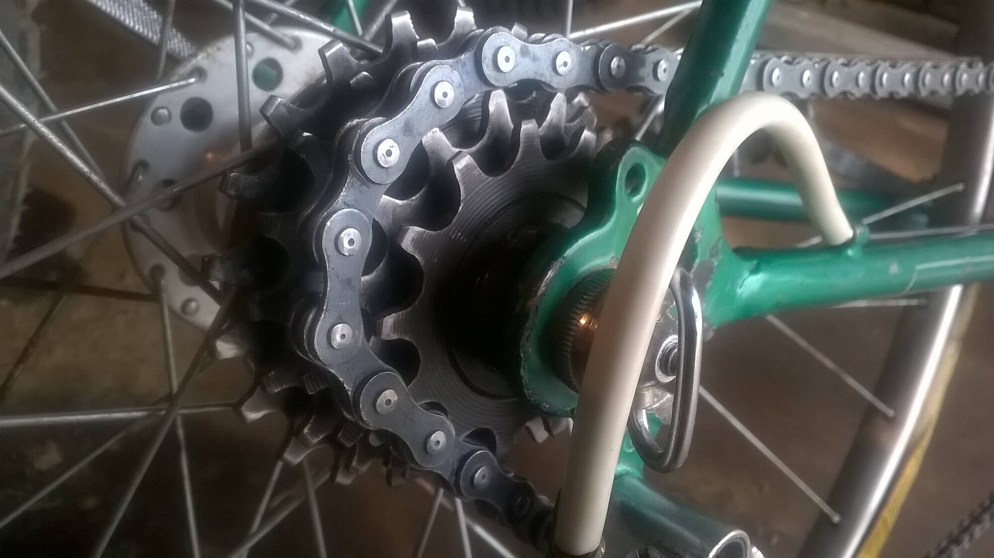 Комментарий к файлу: Если же педали от вращения удерживать рукой (ногами), то цепь в верхней части ОЧЕНЬ сильно провисает. До рамы и даже ниже. НА фото я показываю насколько сильно. Цепь вощеная по технологии мастера [b]Кисы[/b]. Это может быть причиной?