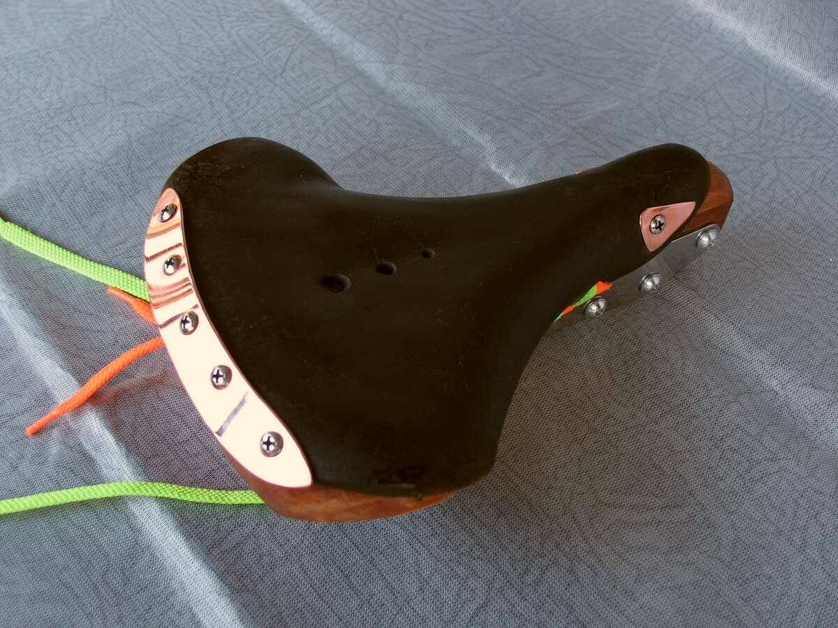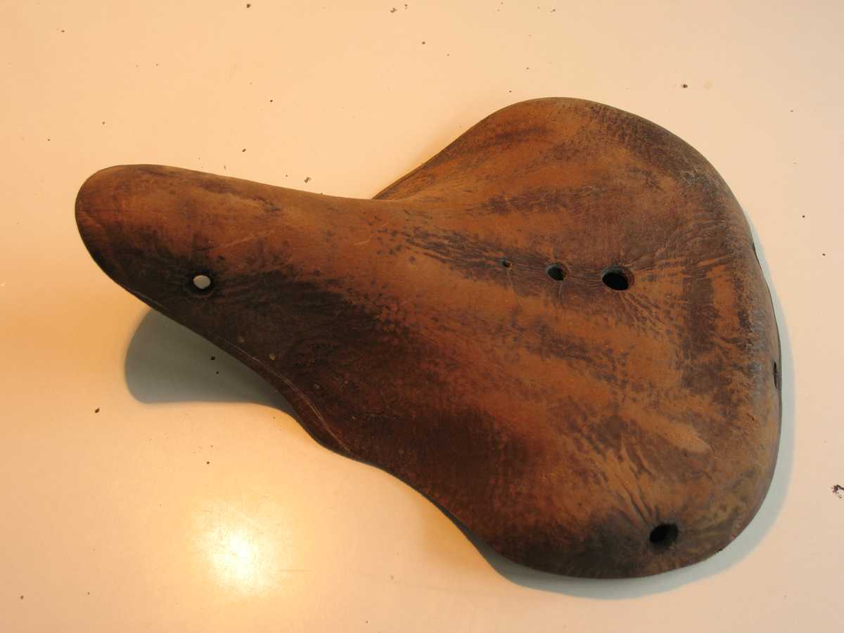 Что-то надо было с этим всем делать. Пропитал его маслом. Оставшимся от деревяшек. Стало чуть более упругим, не мягким - всё ещё как доска, но трещать перестало. И потемнело - из светло коричневого стало тёмно-коричневым, почти чёрным. Ещё несколько раз пропитал. В конце концов просто наливал лужицу масла внутрь и размазывал. Со временем оно всё впитывалось без остатка и седло оставалось почти сухим но слегка масляным. Таким образом кожа тоже потяжелела как и деревяшки, но стала уже напоминать кожу а не фанеру. При стуке звук уже был не таким звонким как по дереву. И хоть немного начала гнуться без треска и опасения что сейчас разломиться пополам.