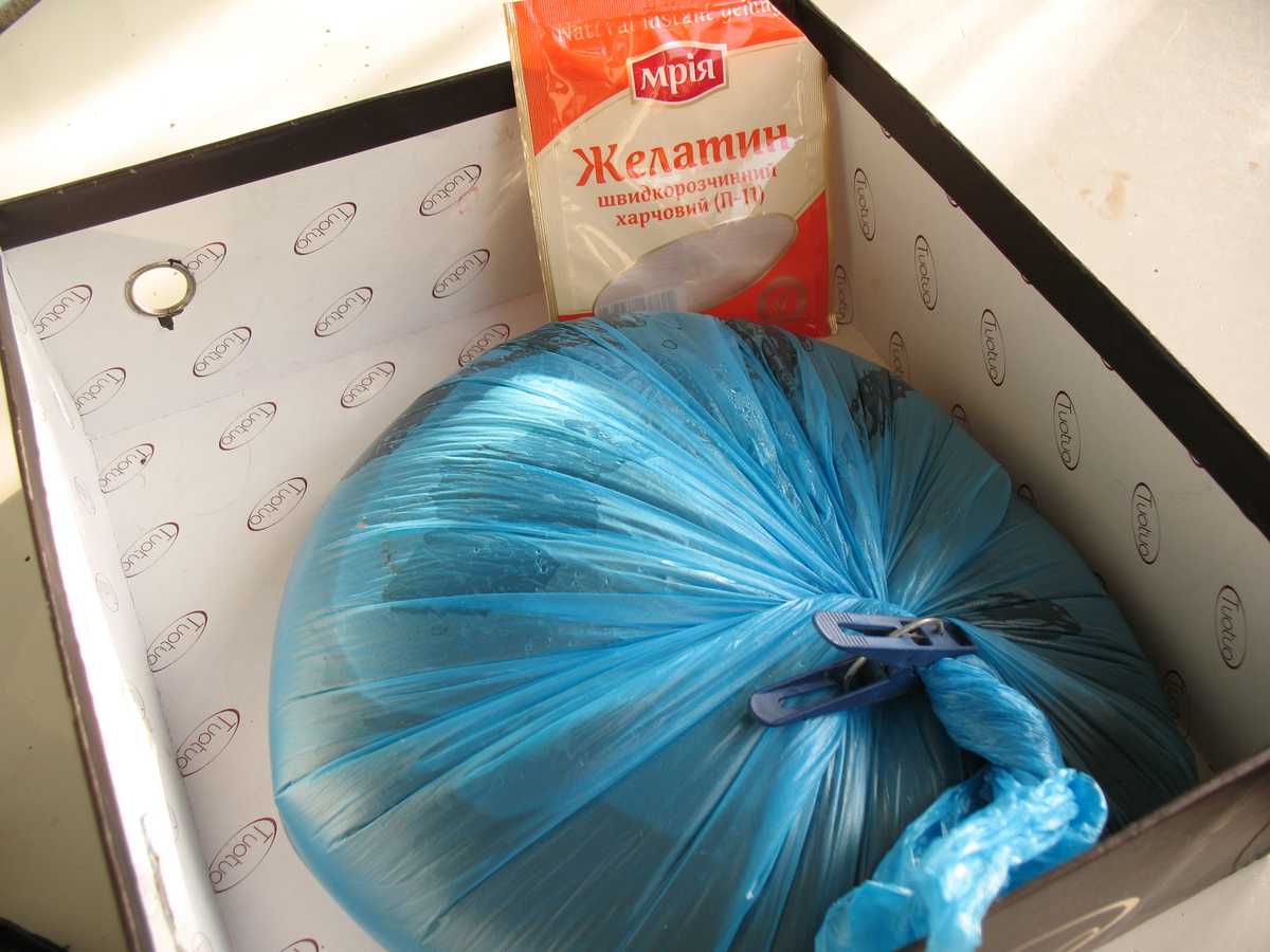 И раньше я уже пытался его размочить горячей водой но ничего не вышло - каким он был, таким остался, на воду никак не прореагировал. Поэтому в этот раз залил водой погорячее. И ввиду того что мягкий, развёл три пакета желатина по 25 гр на два литра воды.