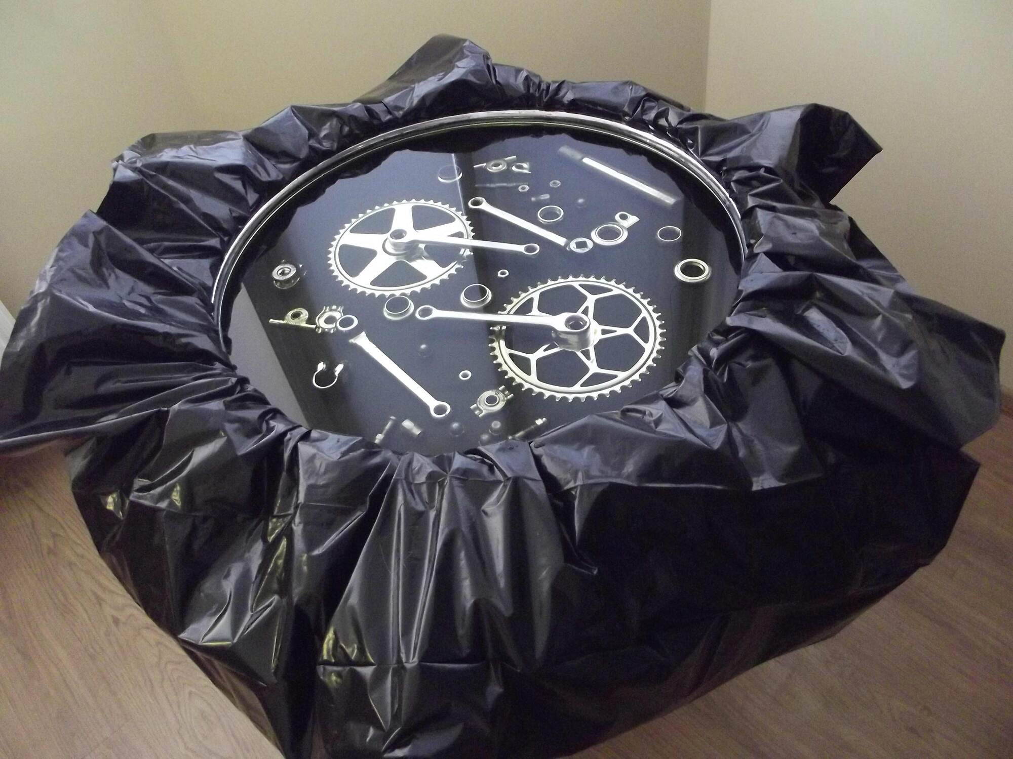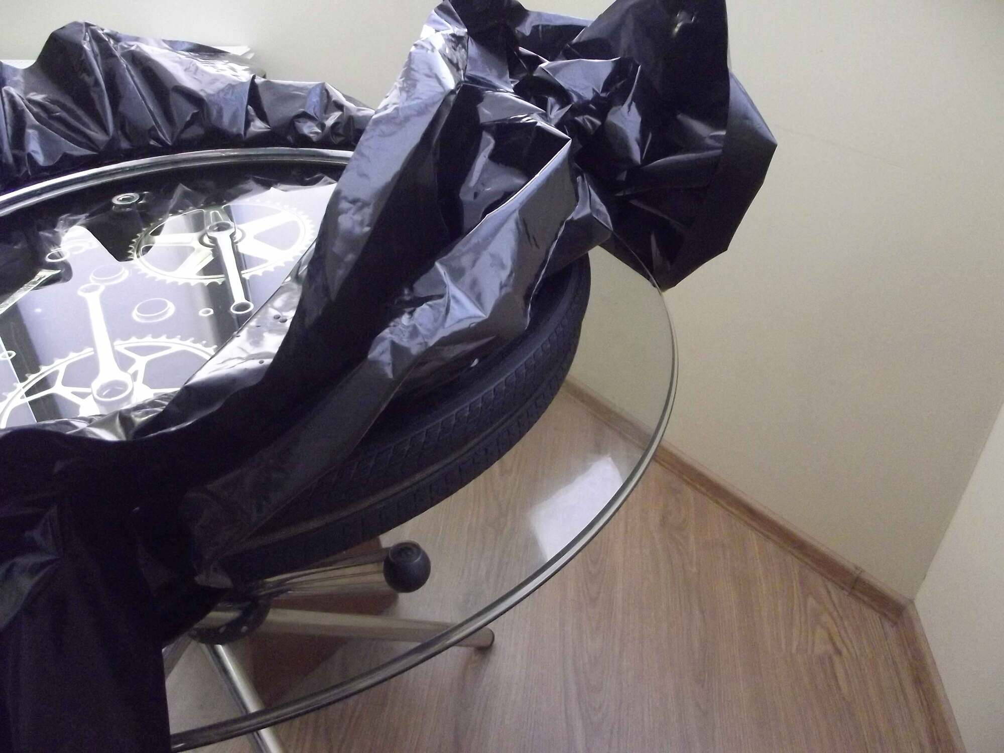 Зато нашёл несколько метров плотной полиэтиленовой плёнки, рукав. Может, кому пригодится способ создания правильной ёмкости из деталей которые есть у любого владельца велосипеда)