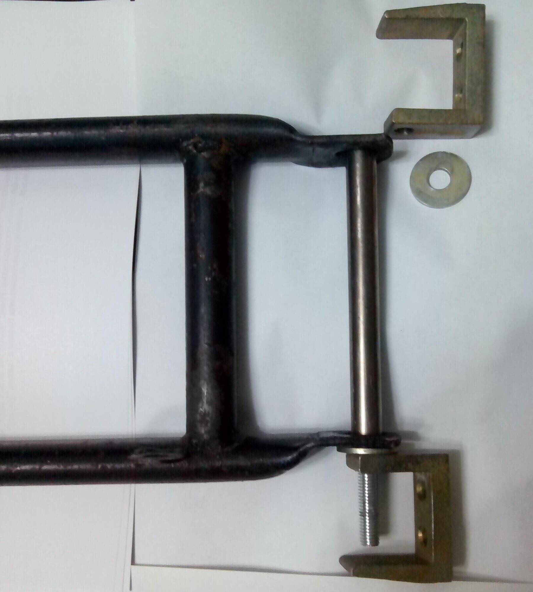 В отверстия вилки мопеда вставляем трубку, в неё пропускаем штырь с резьбой и с обеих сторон накручиваем кронштейны.