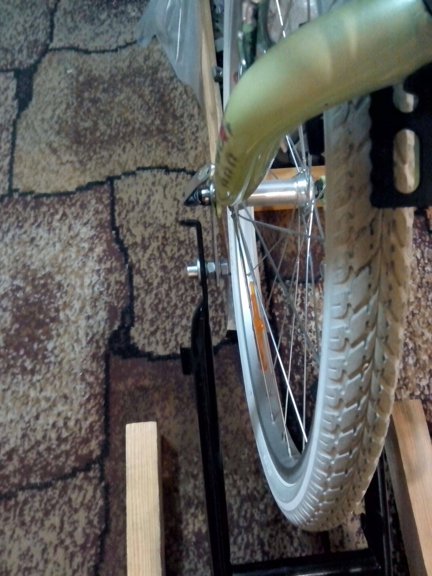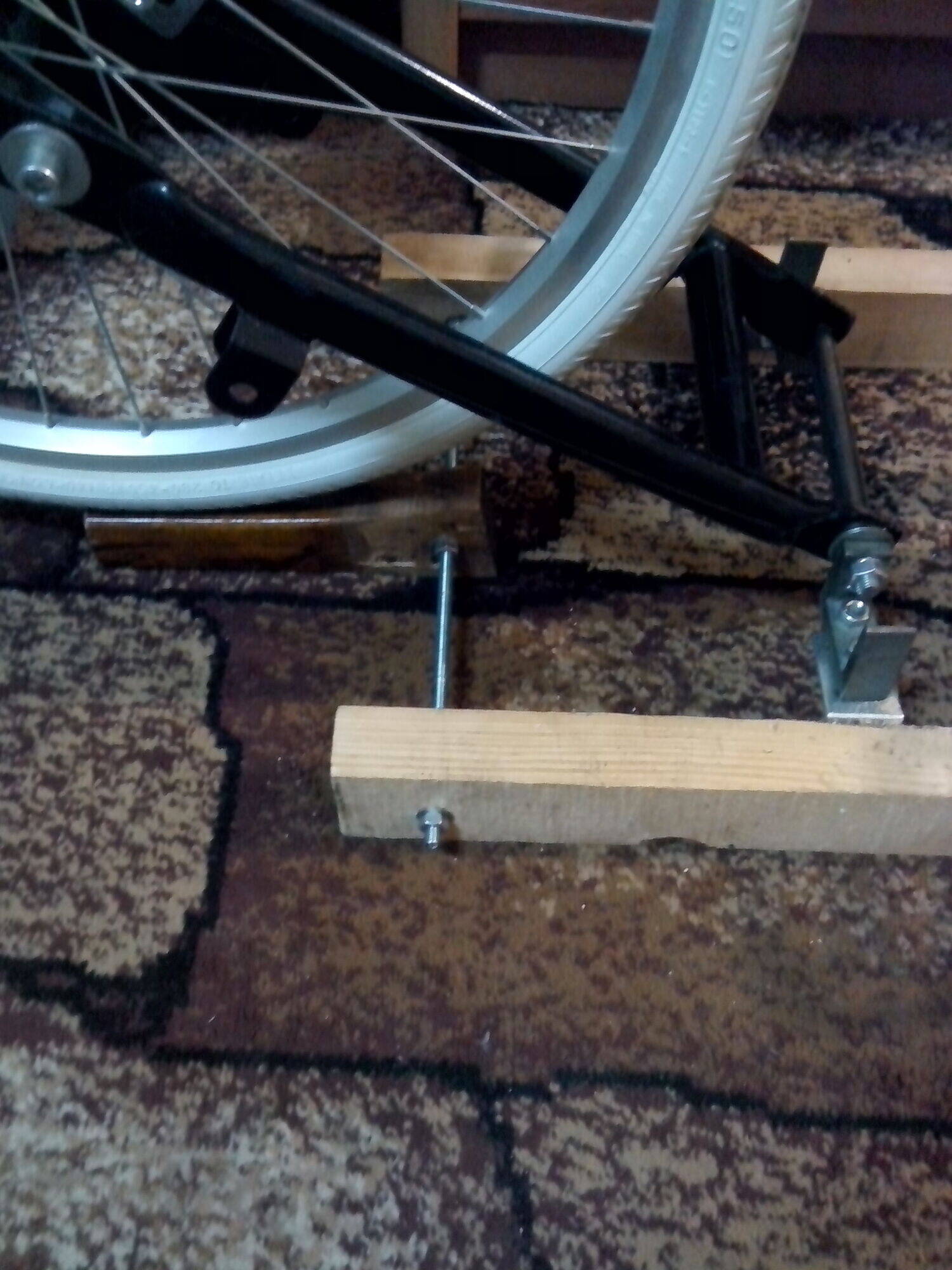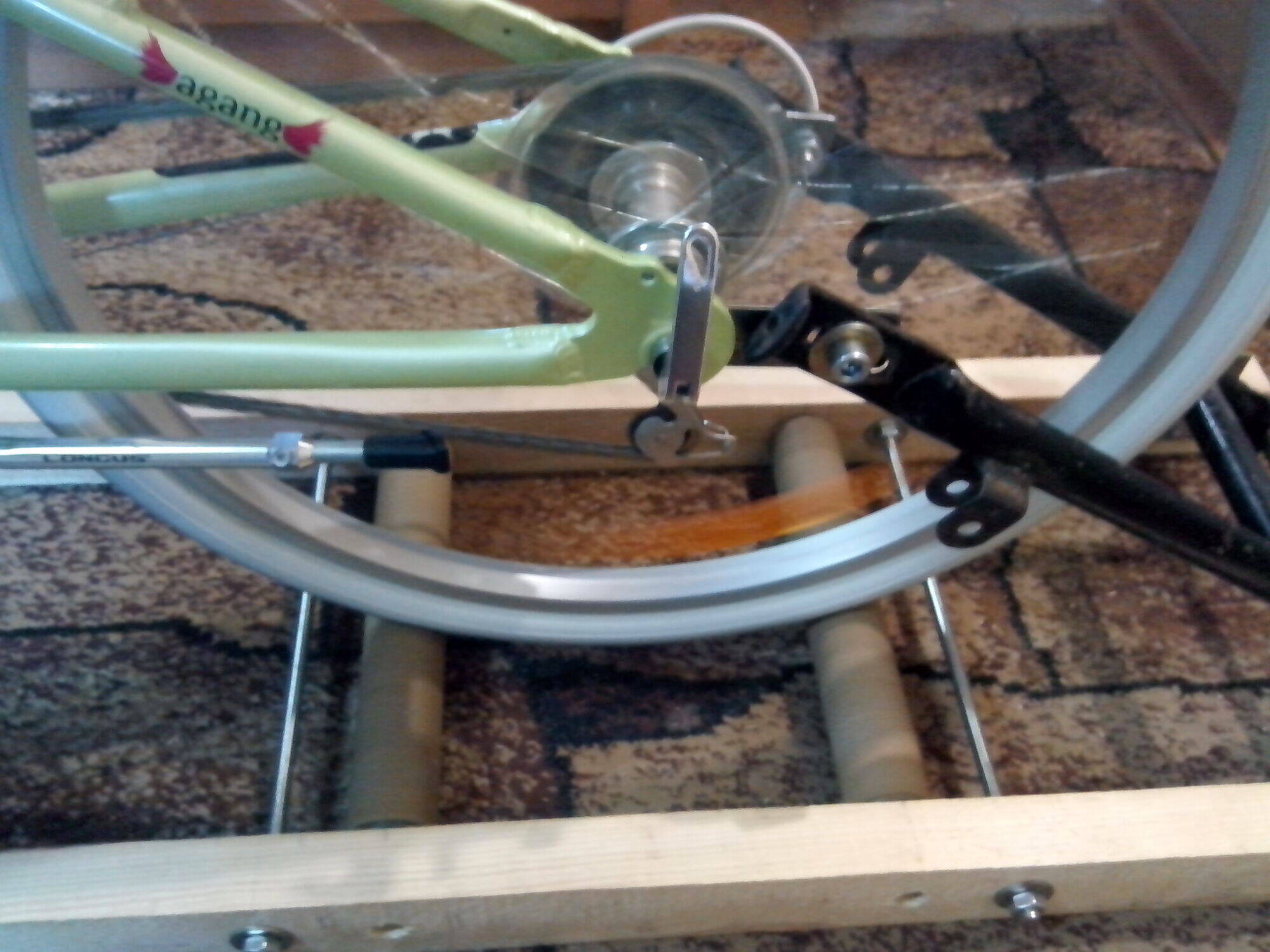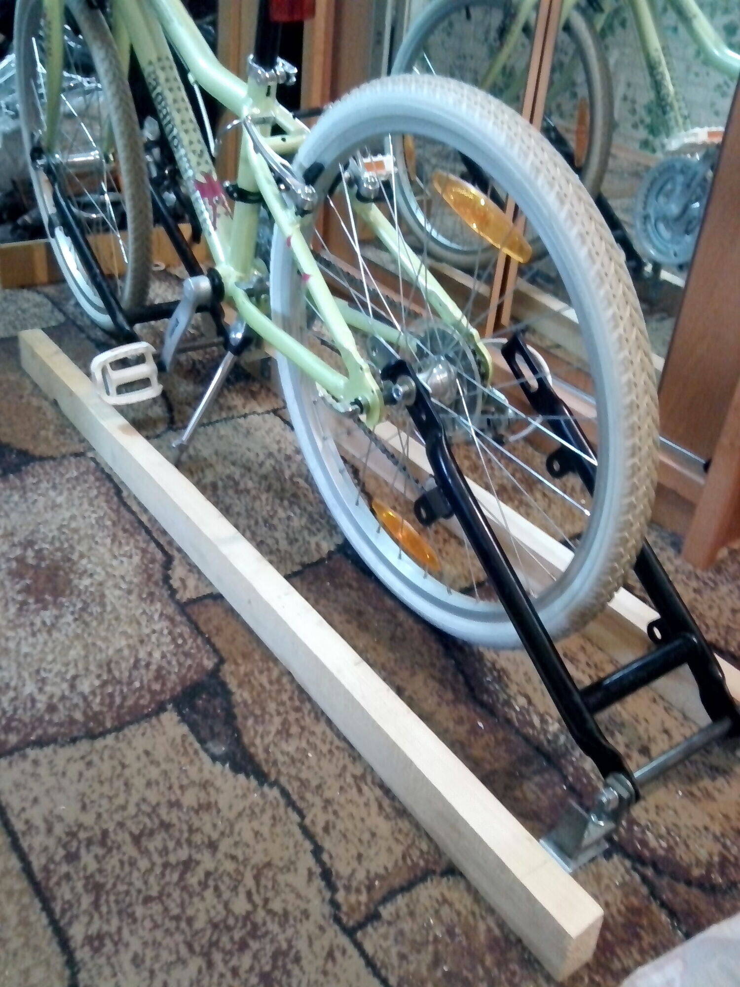 И устанавливаем на станок сверху велосипед, закрепляя четырьмя гайками полосы.