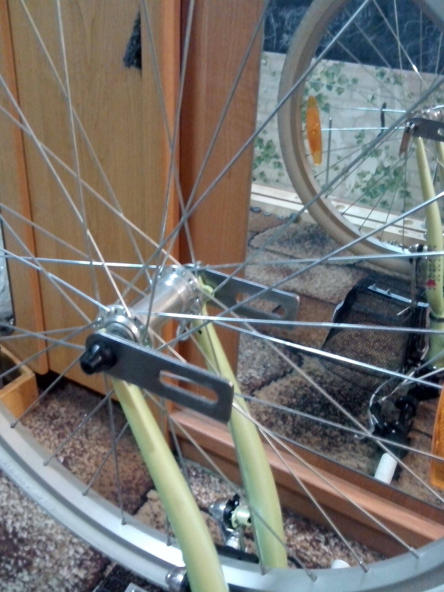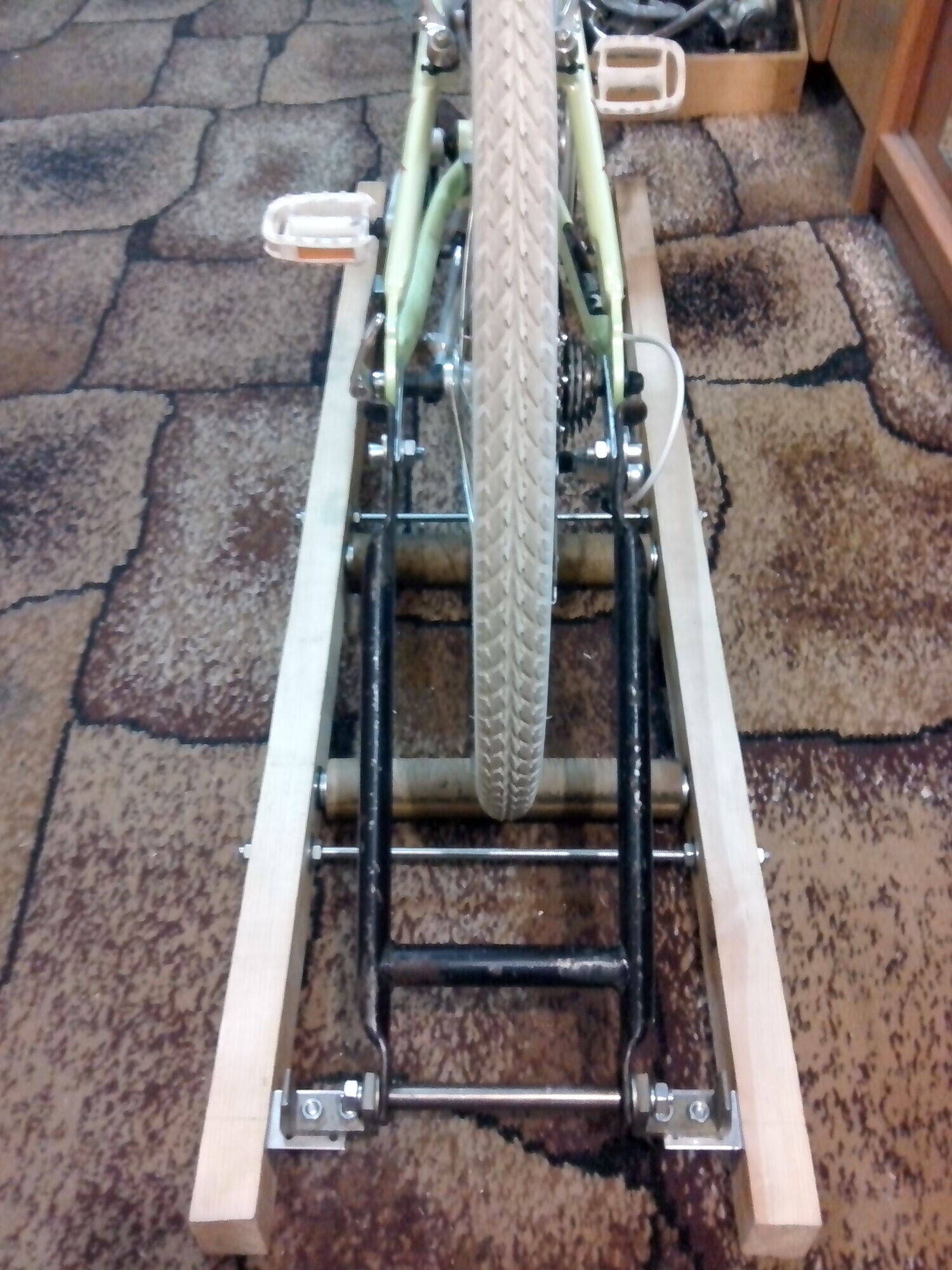 Между осями велосипеда 960 мм, такое же расстояние между осями креплений вилок на брусьях.