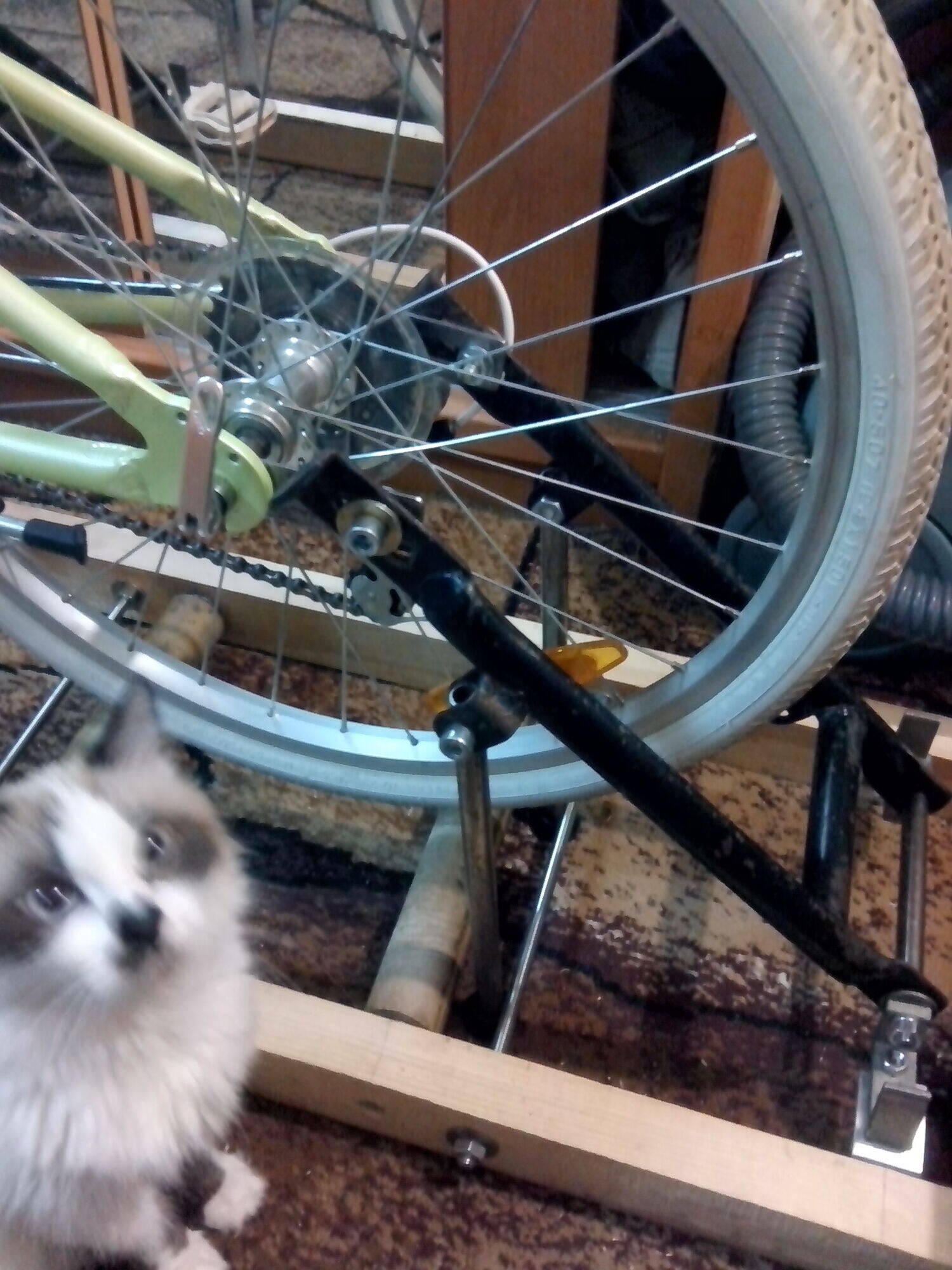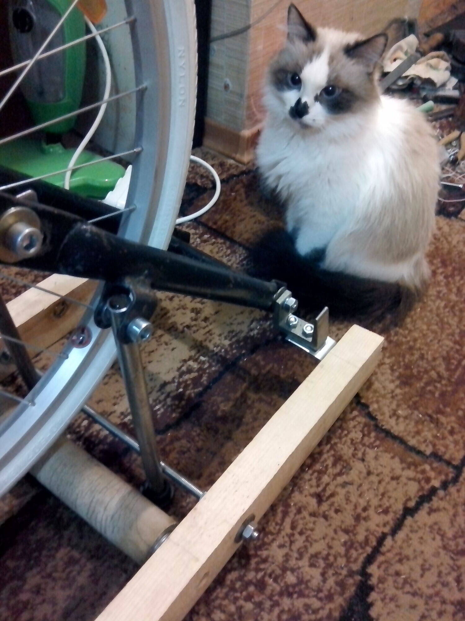 Кошка теперь далеко от велосипеда не уходит, наверно кататься понравилось.