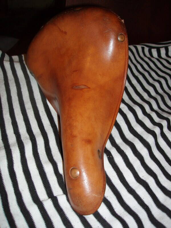 Тааакую сидуху приобрёл по случаю на рынке - никак восторг не пройдёт :) Она не подходит ни одному из моих велов, будет лежать на полочке, пока туристический вел не сделаю себе для походов. Вот моё новое приобретение. И делать с ним ничего не надо - только одну заклёпку поставить вместо винта. Оно чуть просевшее, натяжной винт ослаблен. По дороге с рынка показал другу-сапожнику из будки, он повосхищался, смазал очень слегка (совсем-совсем чуть-чуть) каким-то дешёвым бесцветным кремом с запахом прополиса. Запретил мне смачивать его водой, натягивать болт и вообще трогать до установки на велосипед. Сказал, что медовый цвет - естественный цвет кожи, но сидуха обработана лаком, поэтому от всяких кремов и протирания ж.. не темнеет, как у нас с вами при восстановлении. Каким лаком - не в курсе, он обувь ремонтирует, а не кожу заготавливает :).