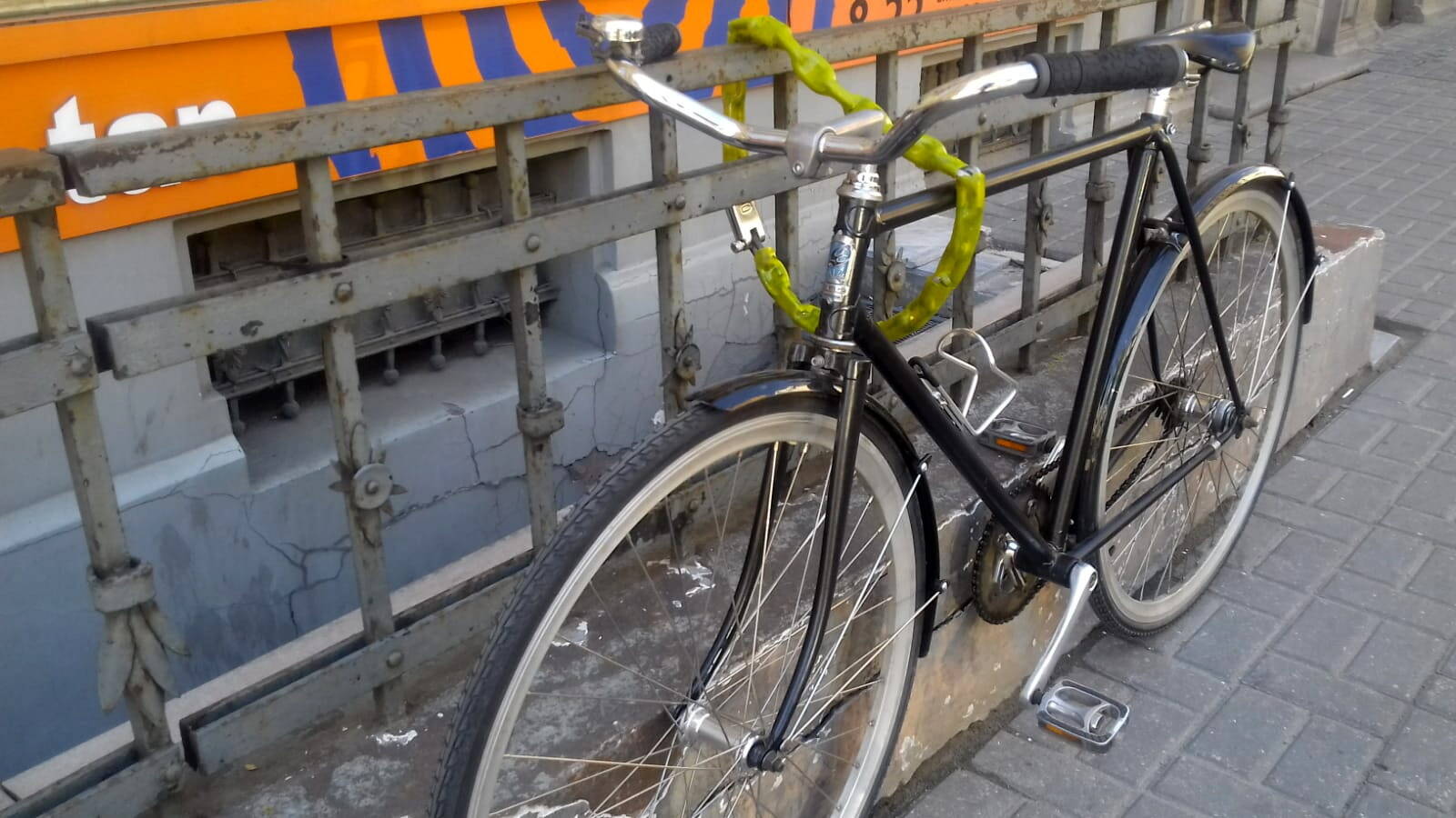 Проезжал мимо. А ведь из стартика можно сделать вполне красивый городской велосипед - вот экземпляр, судя по раме, поздняя. Хорошо покрасив и собрав на неубогих деталях, может выйти легкий комутер. От сш, как видим, осталась только рама, вилка и рулевая. Ну, и шильдик прикрепили после покраски.