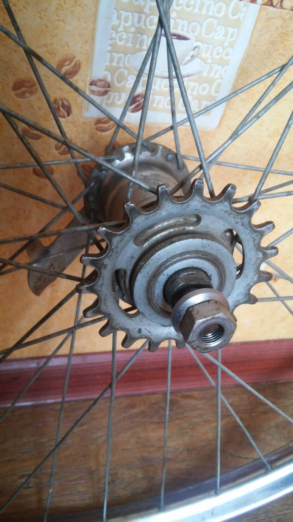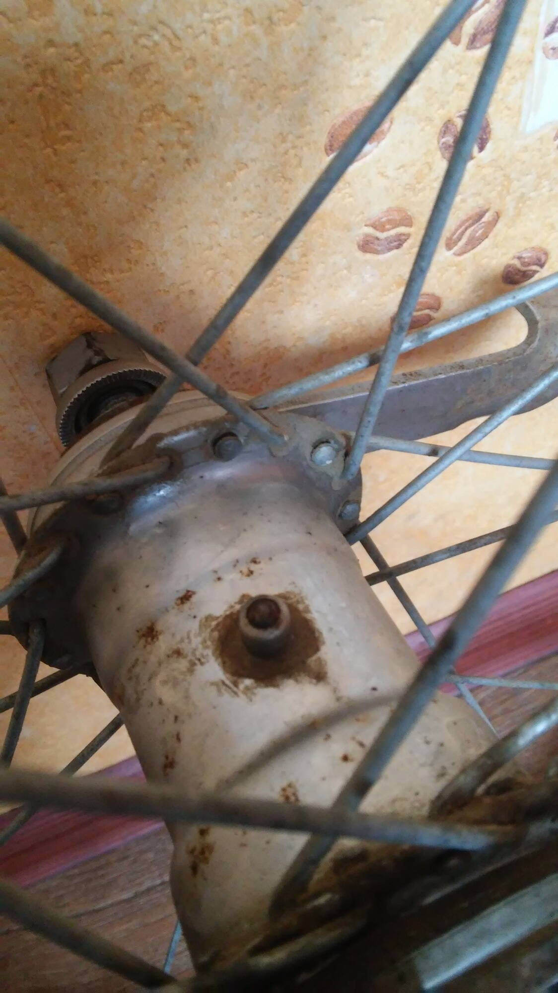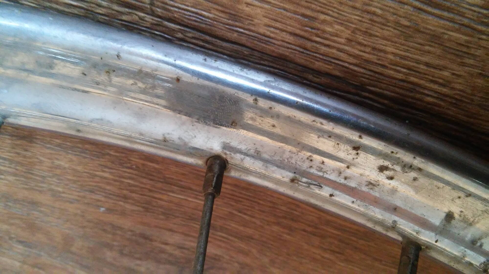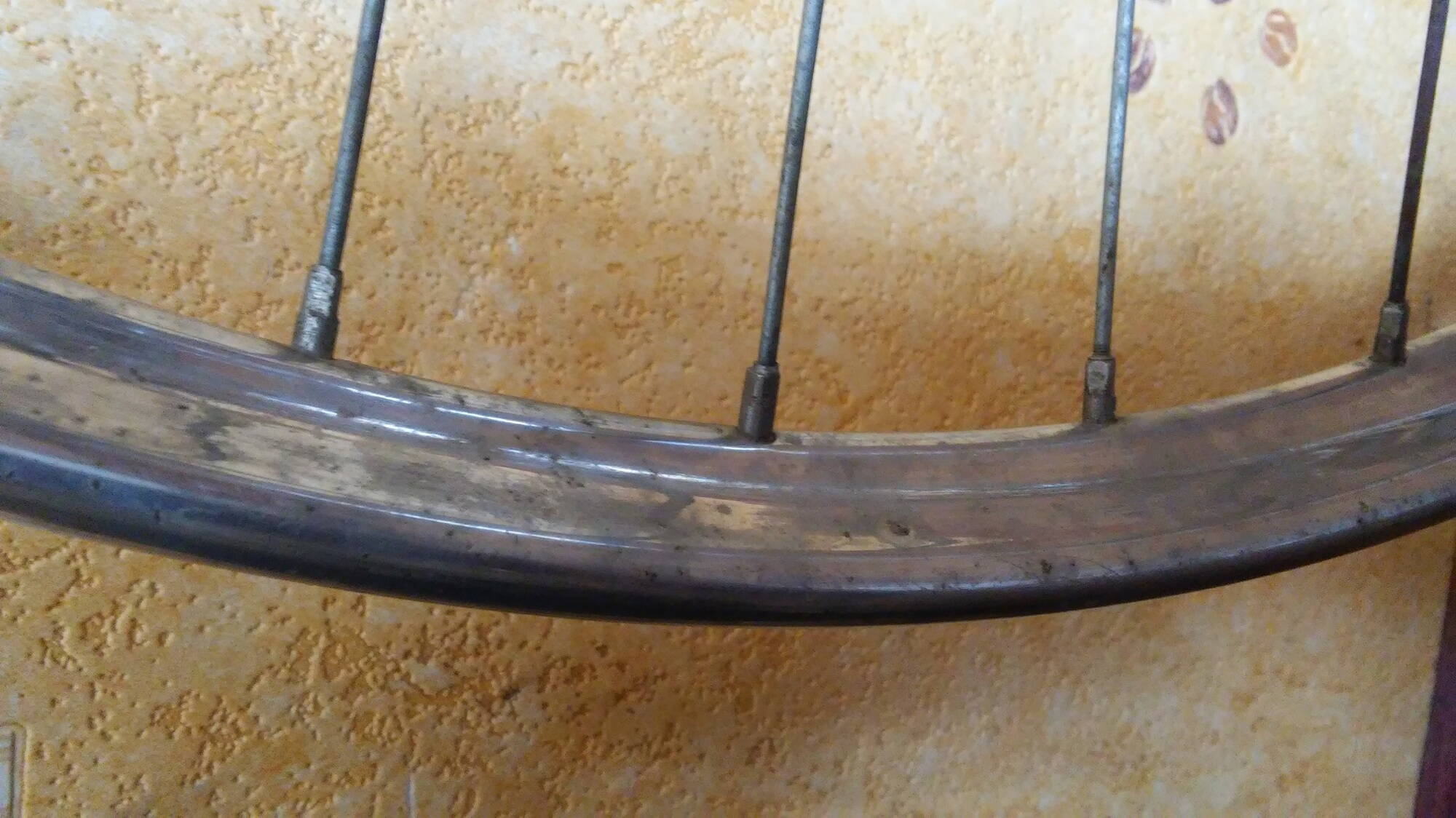 Работа над задним колесом. На фото вид до чистки-полировки. Можно видеть изначально хороший сохран хрома и состояние колеса вообще.