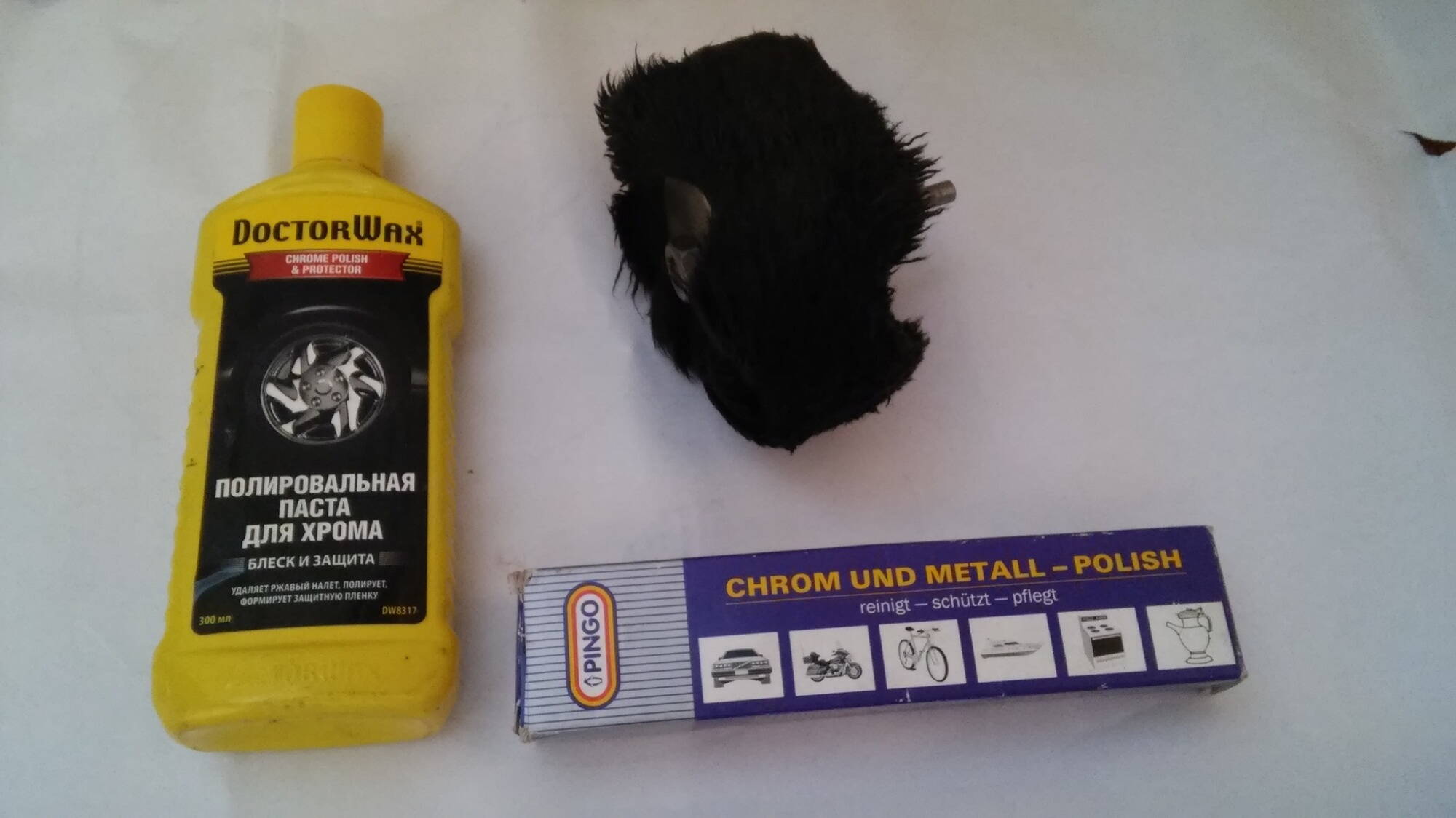 Все средства (кроме круга) куплены в автомагазине, причем паста в тюбике чрезвычайно эффективна и нежно работает с хромом - не царапает и не портит никак + защищает алюминий (насос уже год как не тускнеет, отполированный ей)