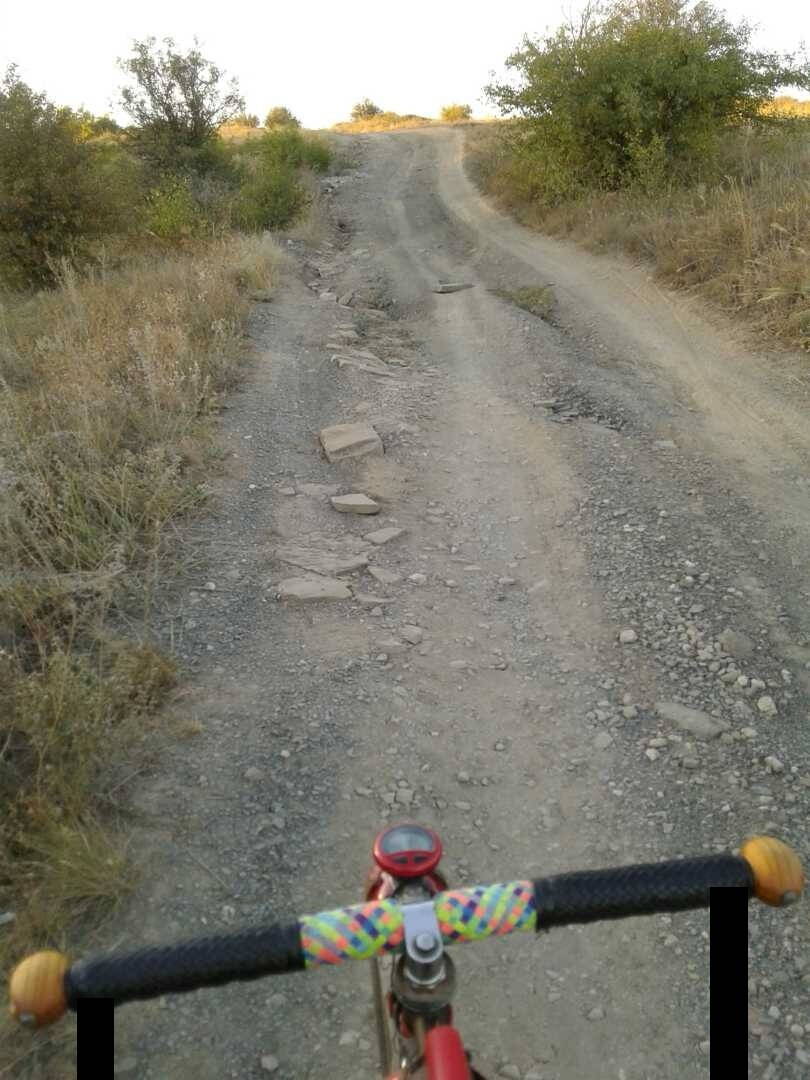 И сразу за ней следует "красный" подъём пешком, за которым ещё два километра вверх по той самой ЩЕБЕНКЕ. Тоже большей частью пешком. Солнце точно по курсу на уровне горизонта лупит прямо в глаза. Ничего не видно. Под ногами хрустит и катается эта грёбаная щебёнка. Даже катить велосипед по ней тяжело. Он прыгает, крутится вертится хочет упасть. Всеми фракциями на сегодня я сыт по горло :) Дальше уже не фотографировал.
