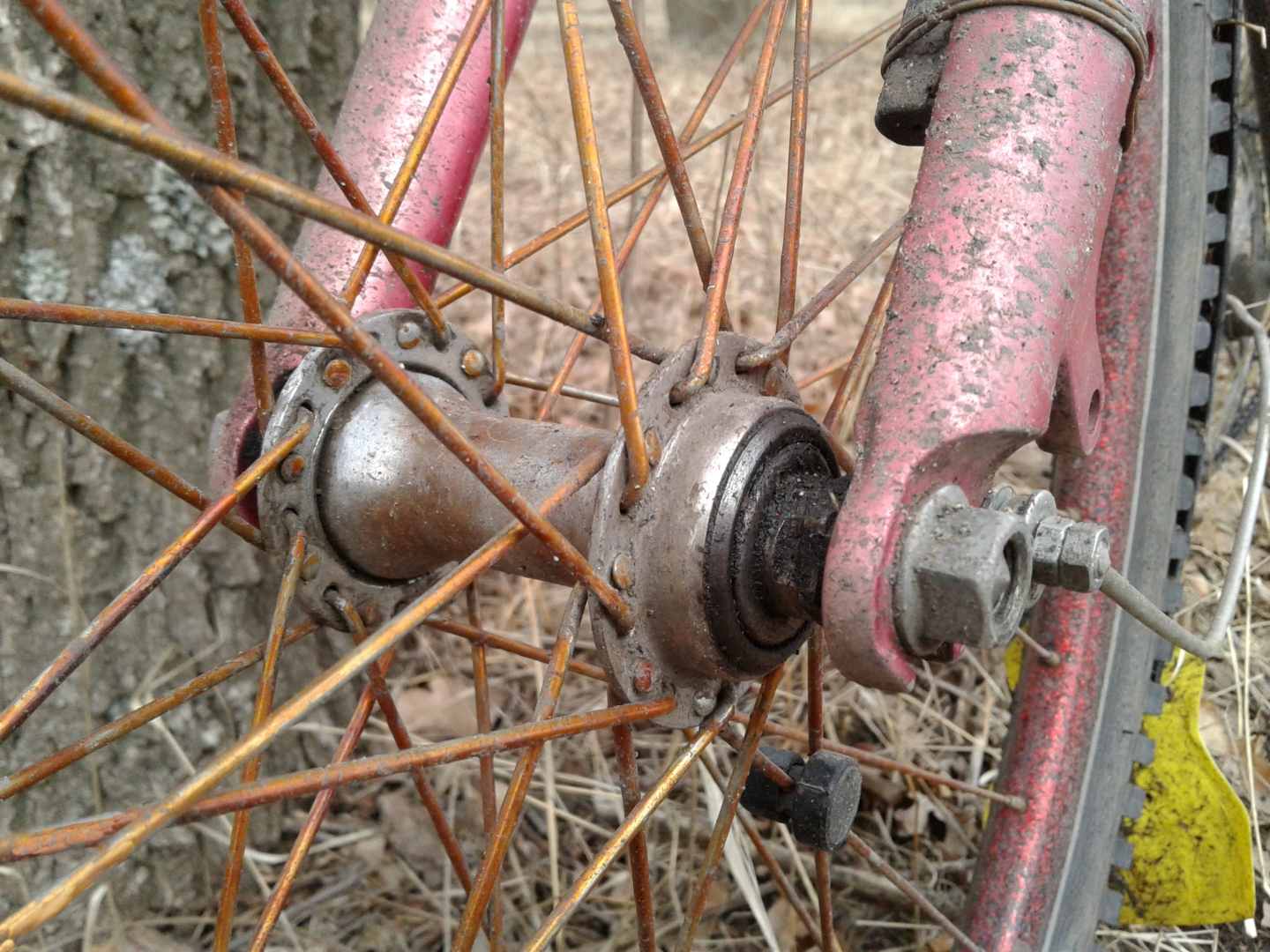 Передняя втулка. Стальная, была хромированная но в попытке её отполировать пастой гои китайский хром протёрся до медного основания. Всё жду когда она поржавеет до состояния рамы, но она никак не хочет :)