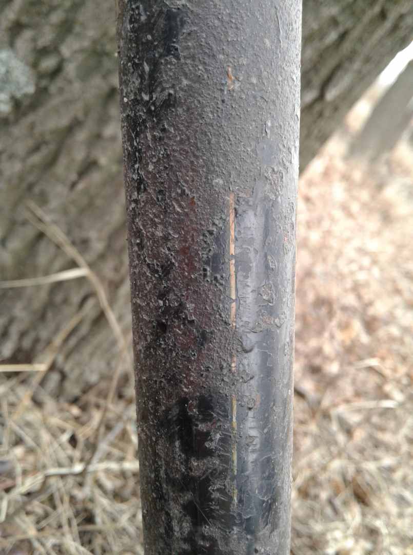 Вилка. Красный лак для фонарей покрылся мелким-мелким кракелюром трещин, нафото этого не видно и вообще заметно только под определённым углом зрения если смотреть сверху. Трещины соответствуют местам нагрузок на вилку - те там где она хоть немного изгибается трещины мелкие и частые, на короне и дропах. Посередине перьев - длинные продольные. Образовалась реальная карта напряжений :smile: Ногтём не чувствуются и лак отваливаться вроде не собирается.